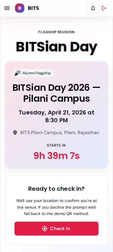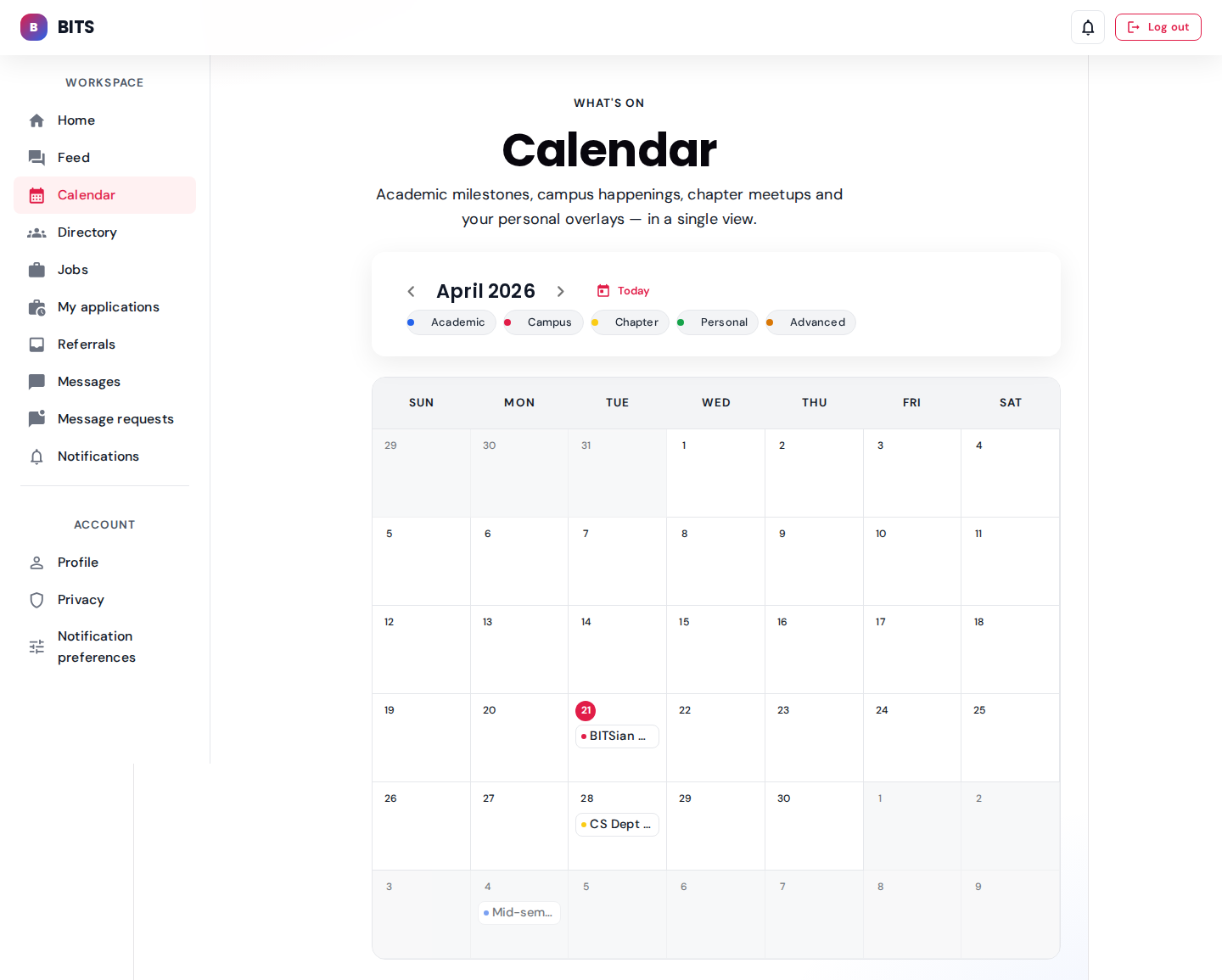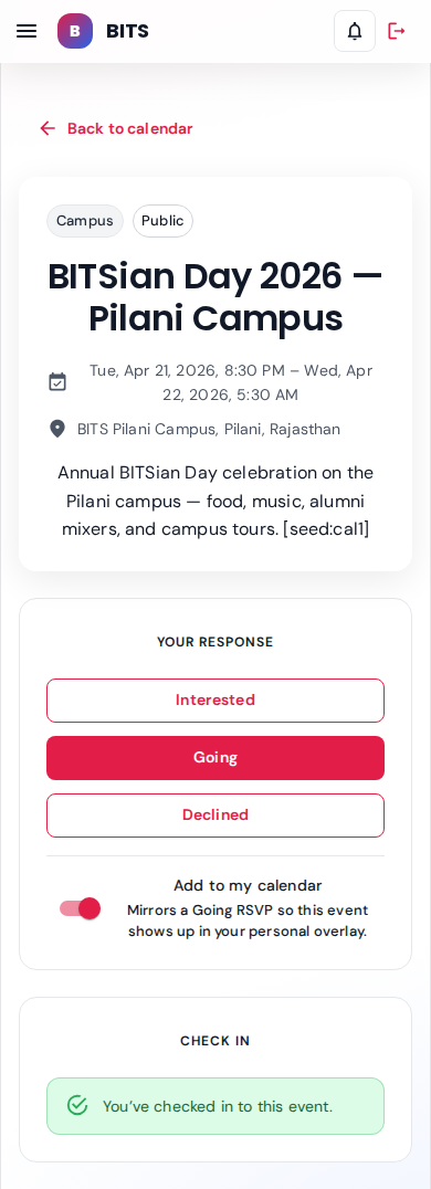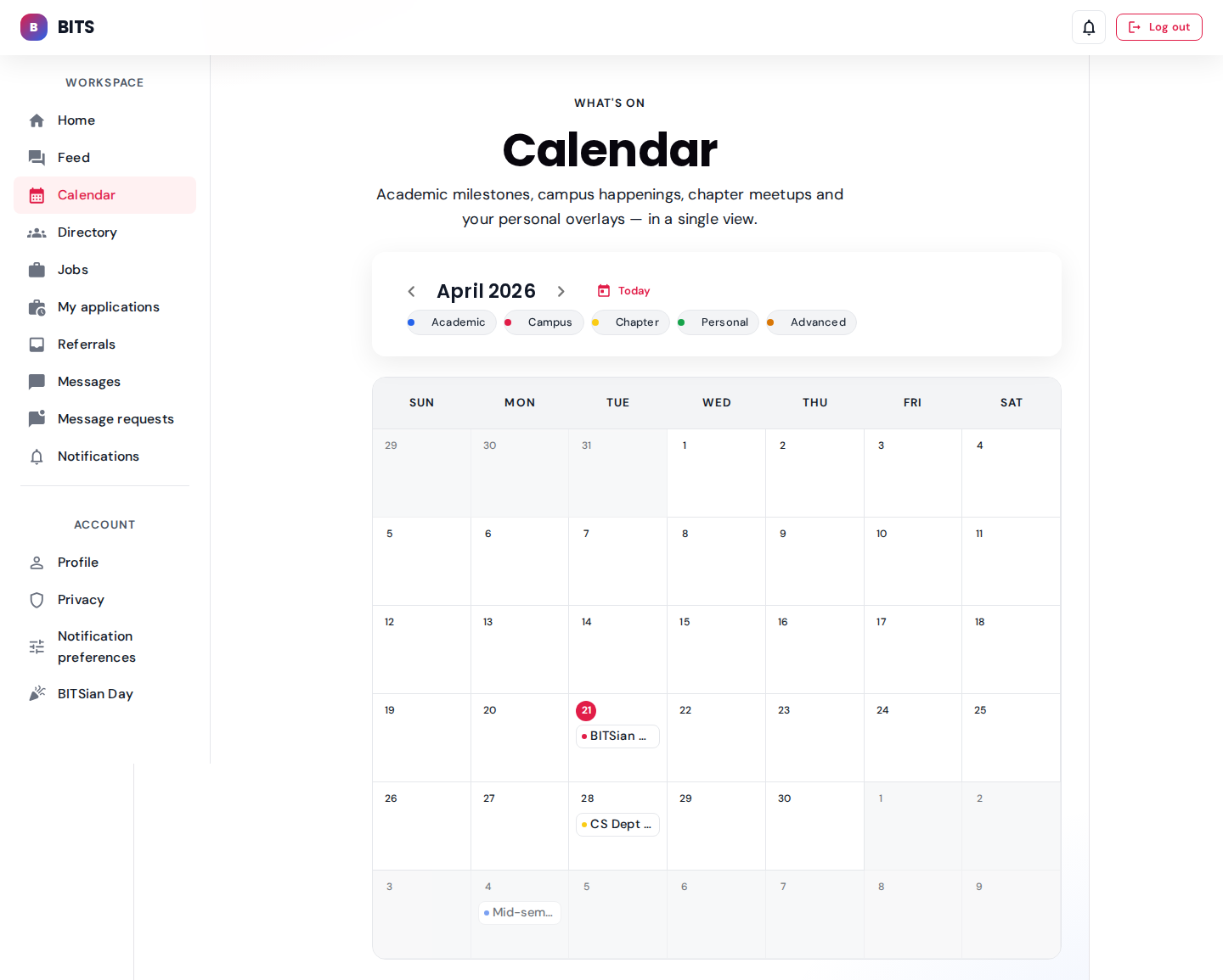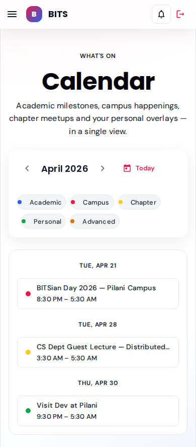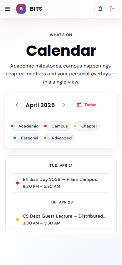 Cross-role campus calendar spanning academic, campus, chapter, personal and advanced events — plus the flagship BITSian Day geofenced check-in flow.