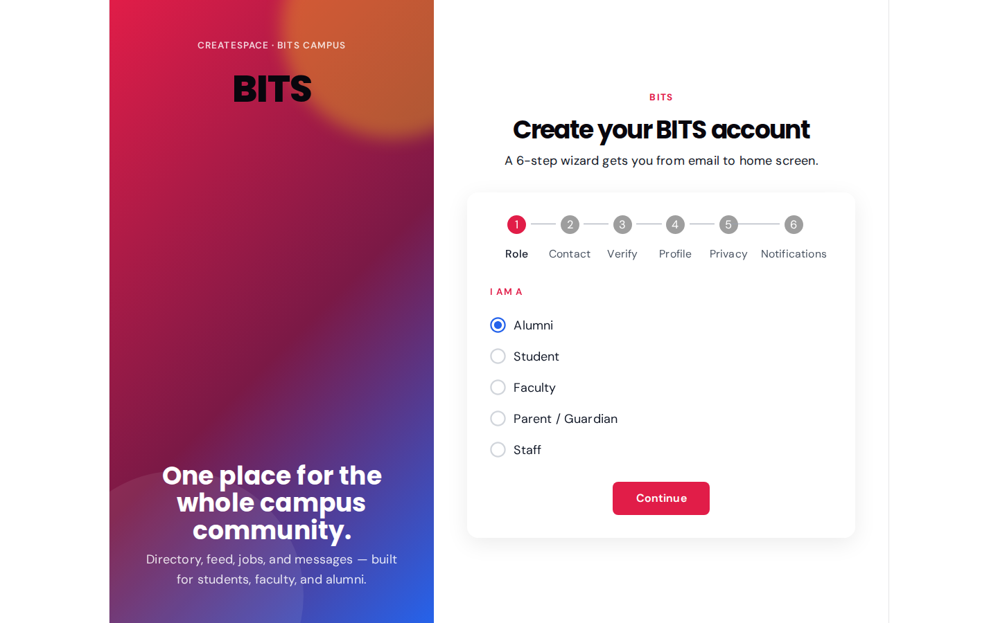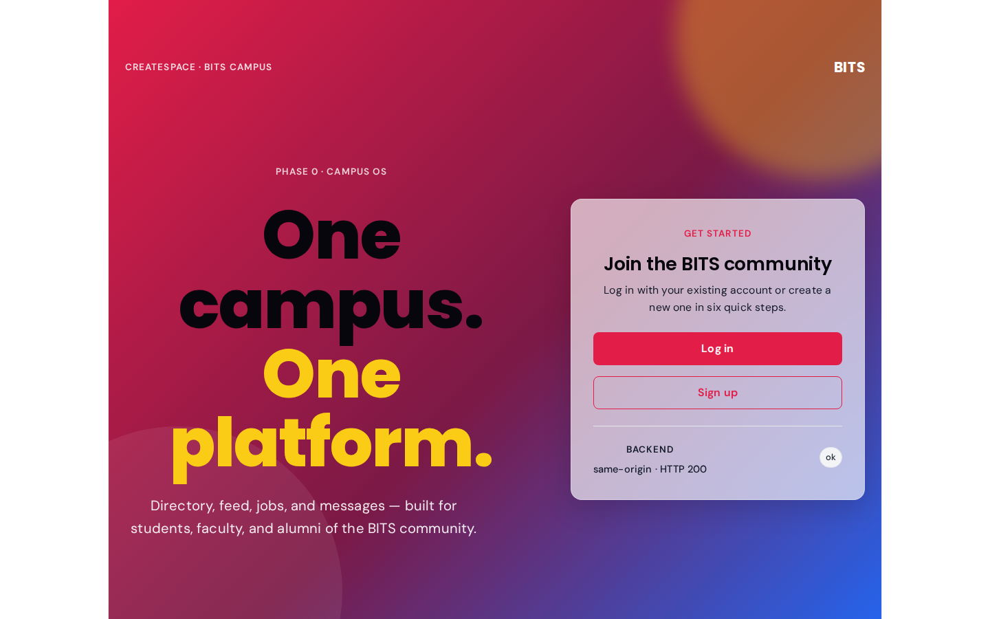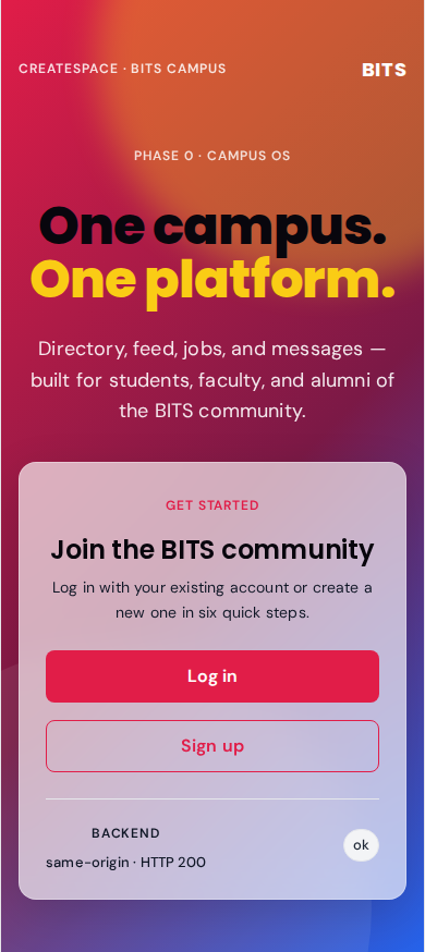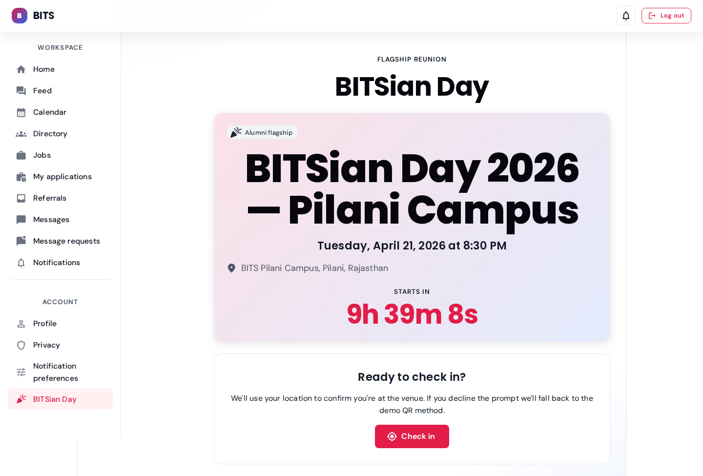 Cross-role campus calendar spanning academic, campus, chapter, personal and advanced events — plus the flagship BITSian Day geofenced check-in flow.