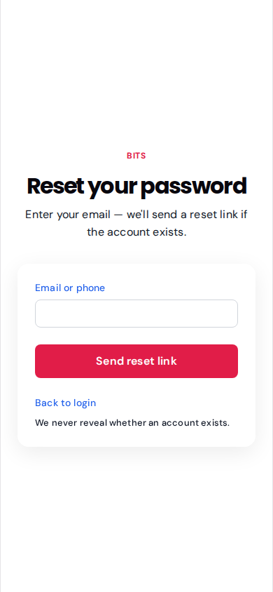 route: /auth/onboardingSend-me-a-link flow. Confirmation page lives at /auth/reset/confirm.