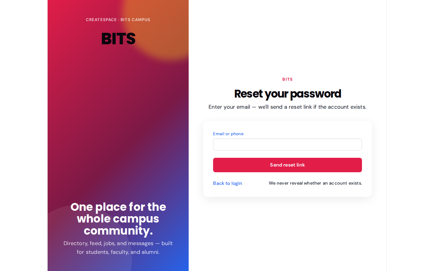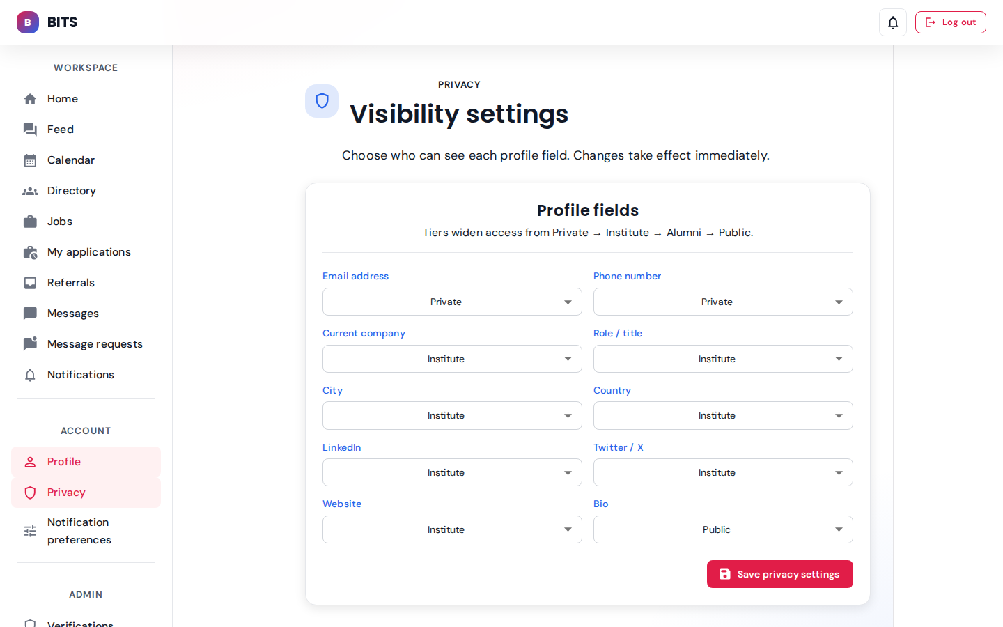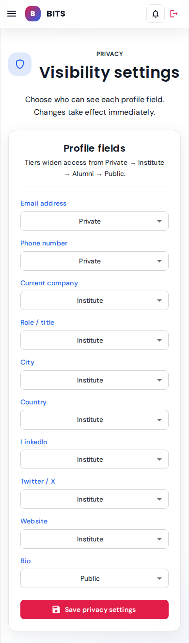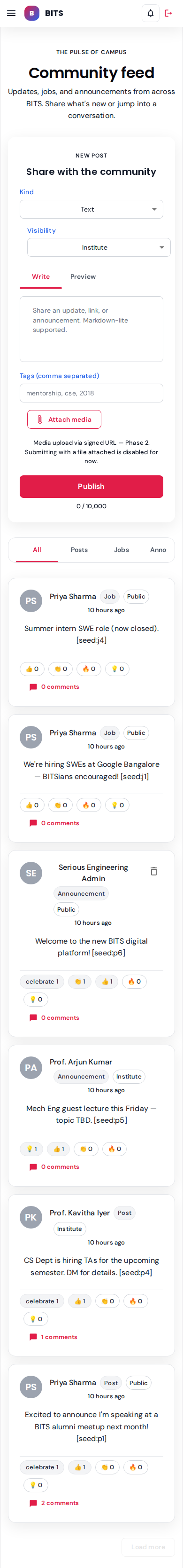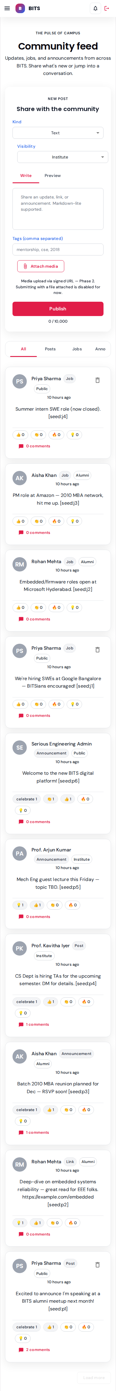 Scoped-visibility posts (public / institute / alumni-only) with reactions and comments.