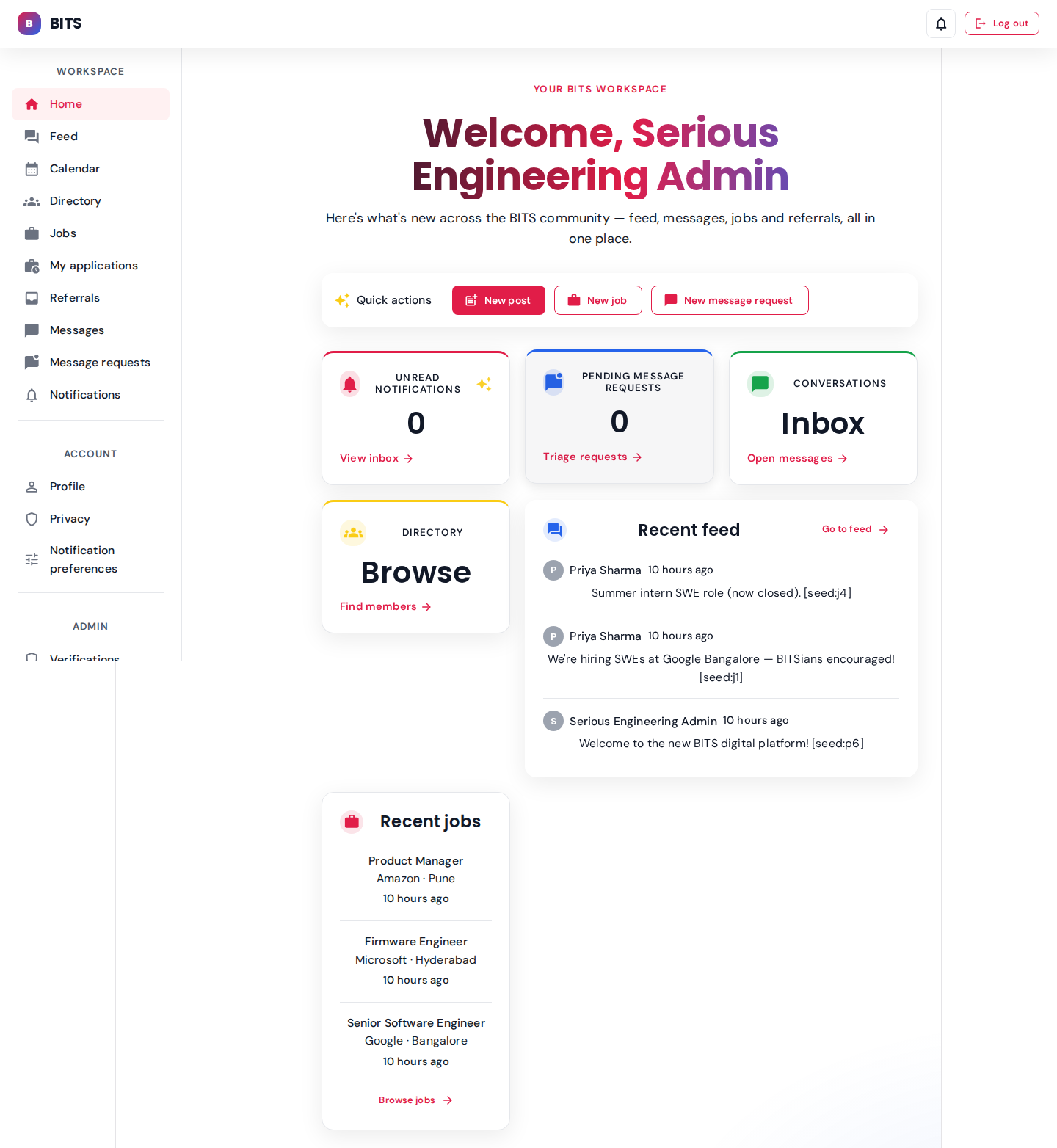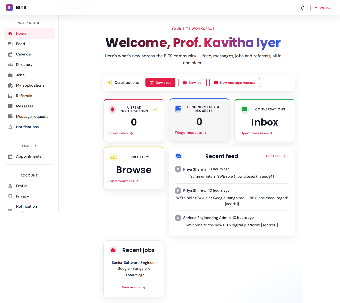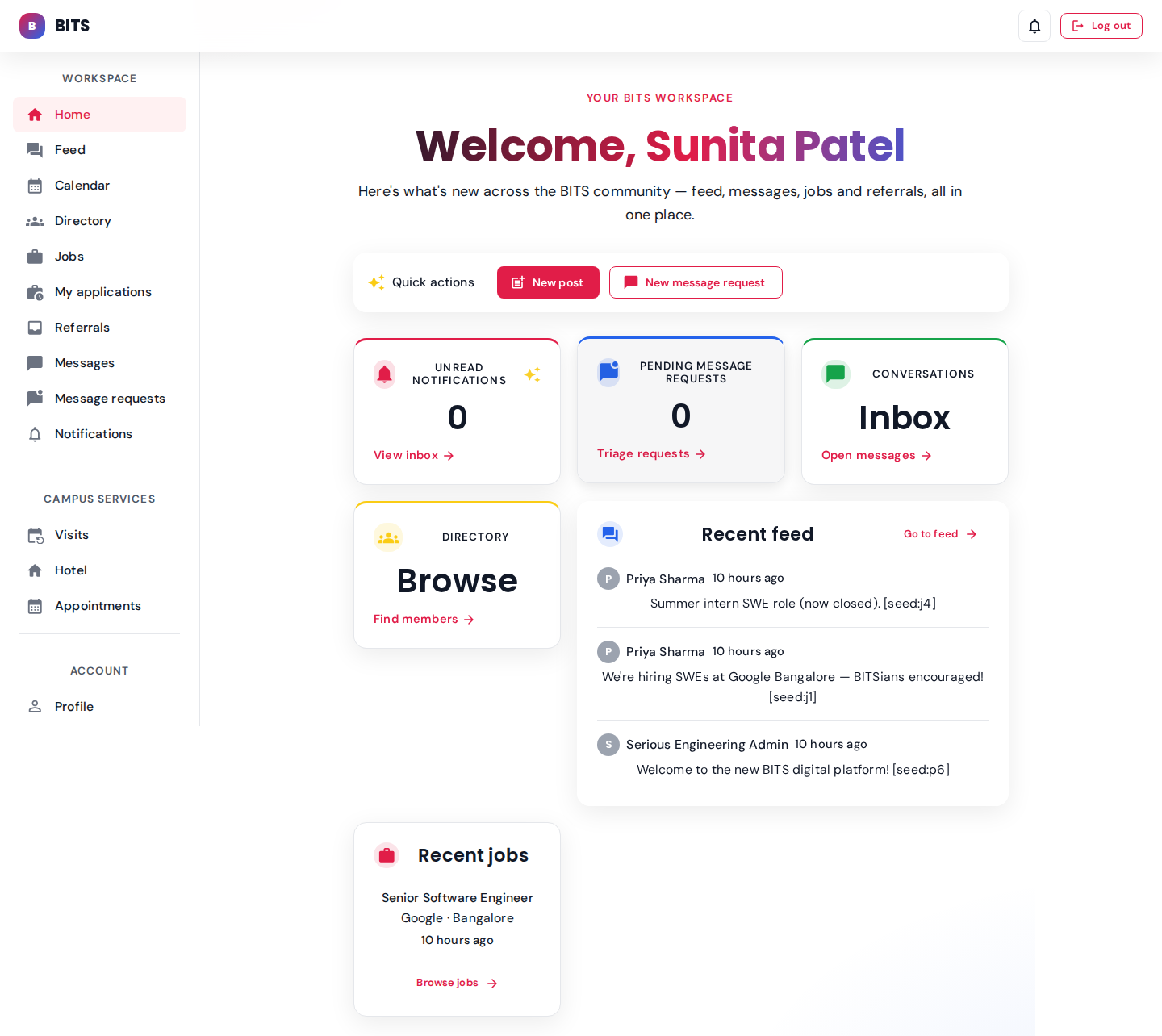 Welcome dashboard with quick actions, unread notifications count (2), and recent feed/jobs rail.