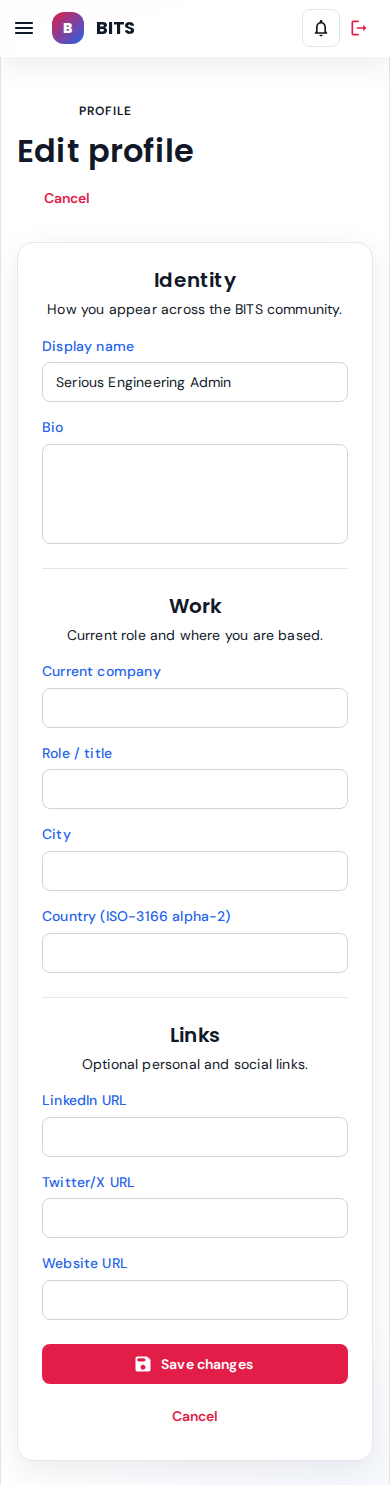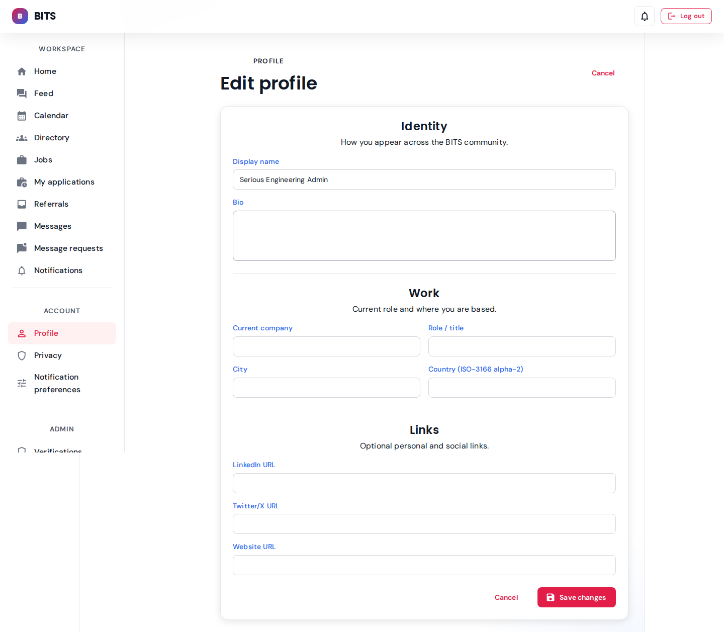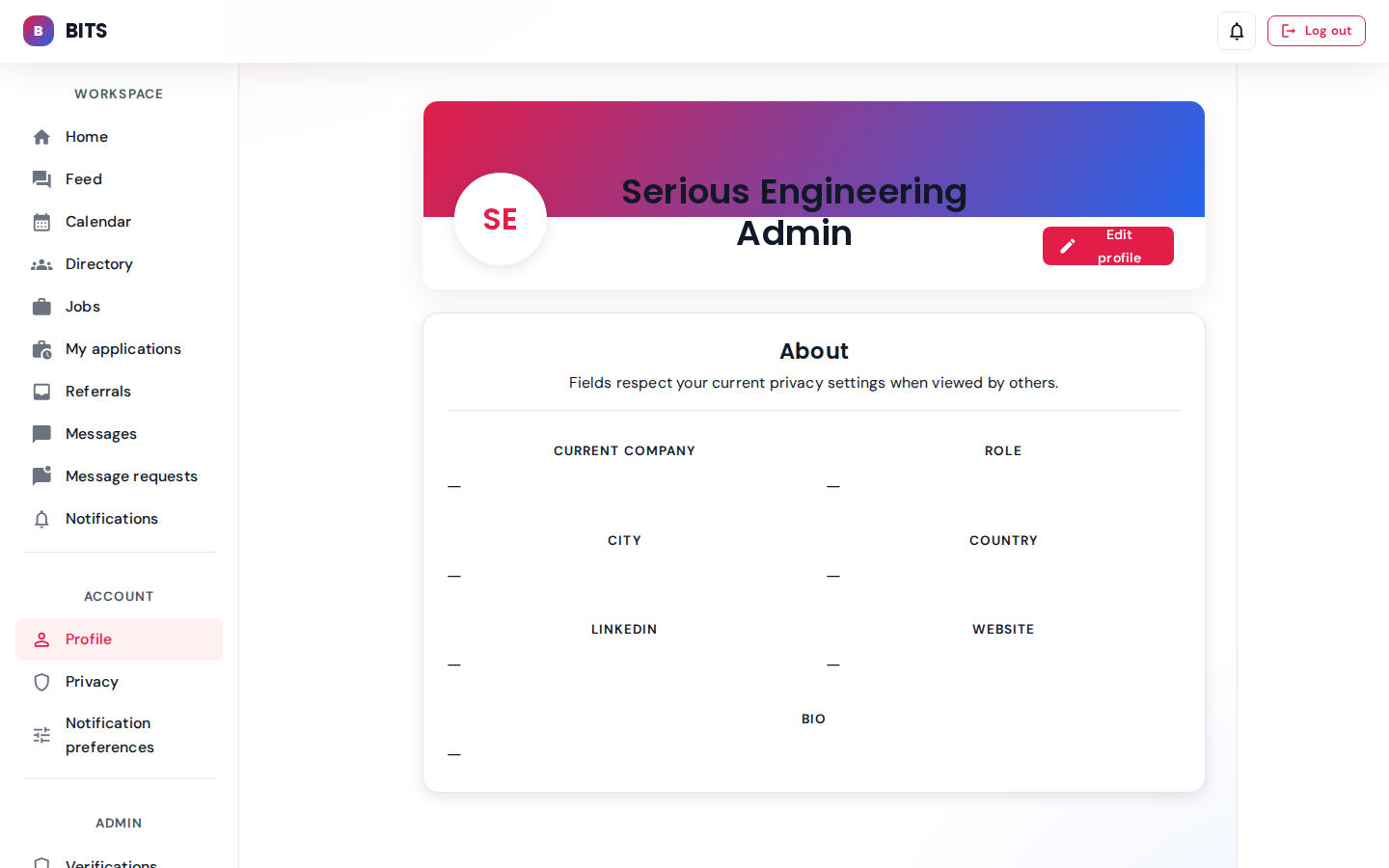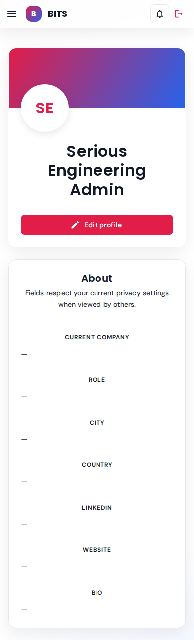 seeded: 2 unread notifications, 4 feed postsRead-only view of the admin's own profile card.