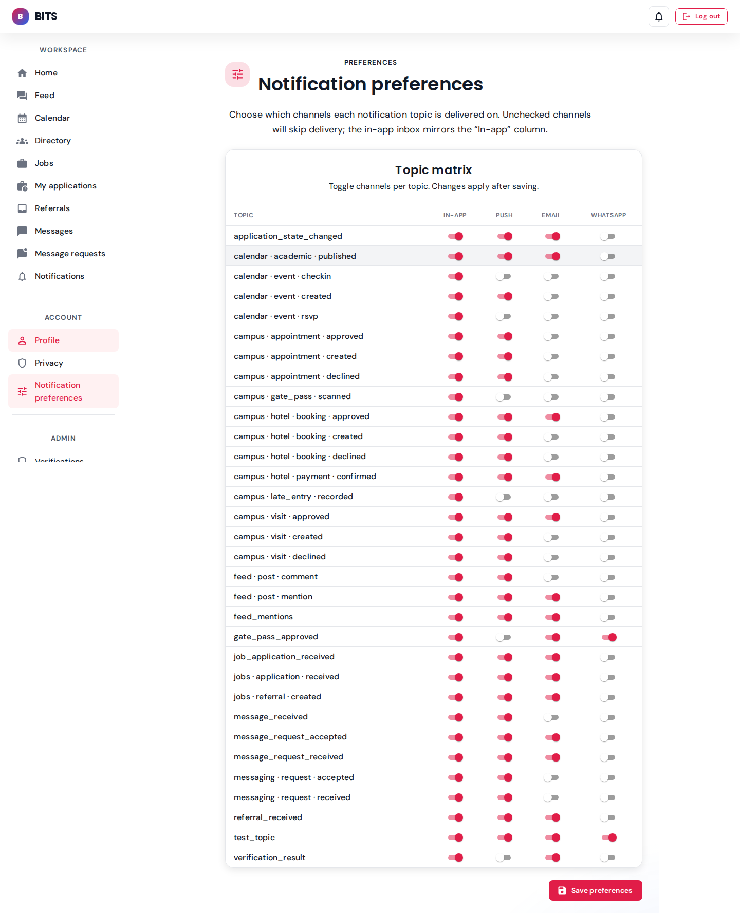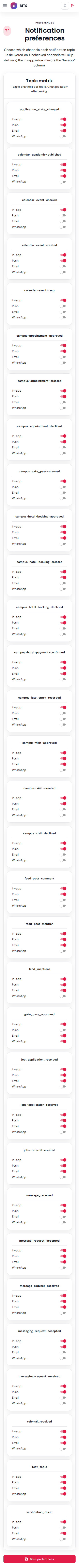 Per-template channel preferences (email / push / in-app) for the 16 seeded templates.