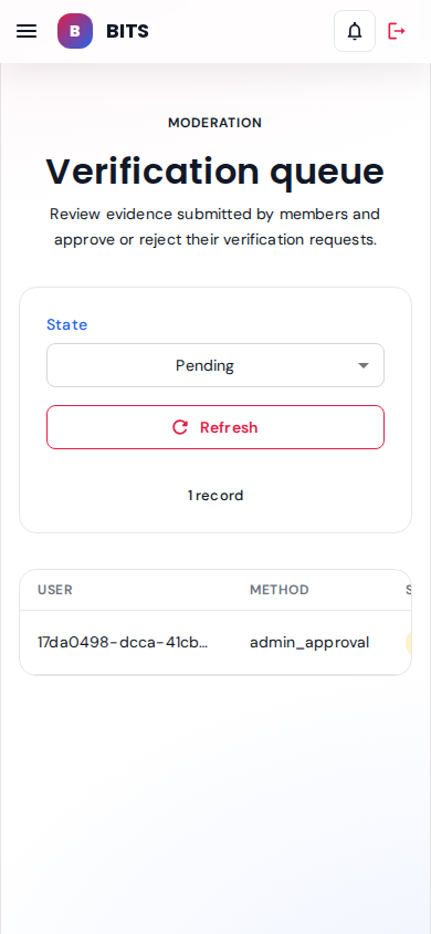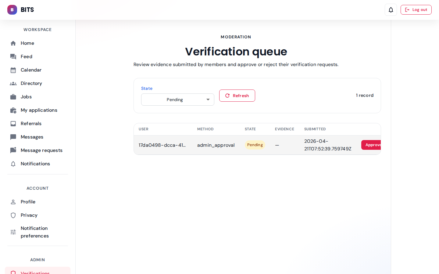 Moderation — admin_approval method, Pending state. Vikram's pending verification request is the single record here.