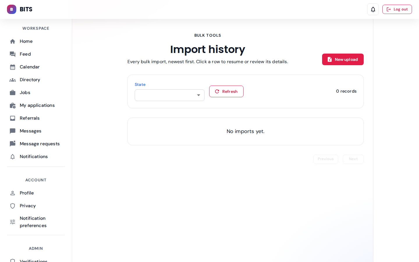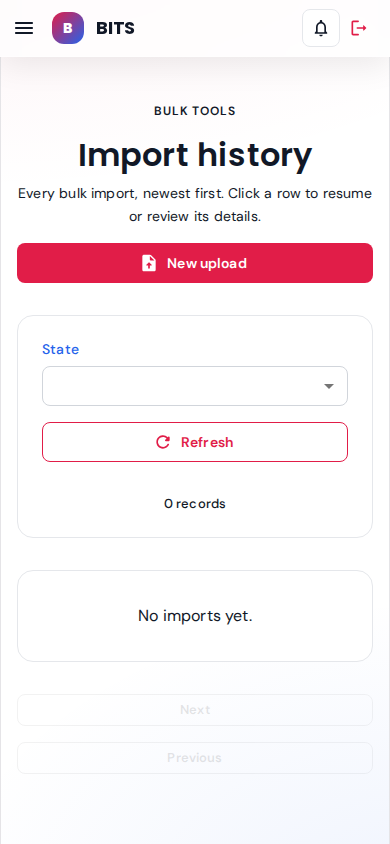 Bulk import log — empty state shown (no CSV uploads seeded). "New upload" button initiates a fresh import run.