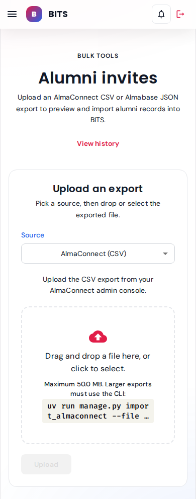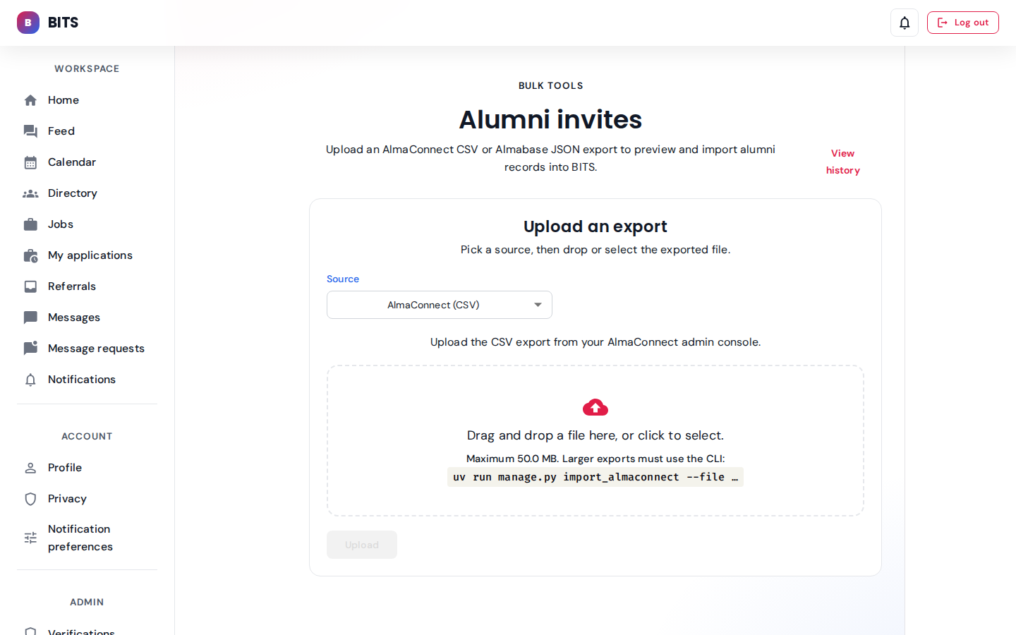 Bulk tooling surfaces for onboarding large cohorts of alumni and ingesting legacy rosters.