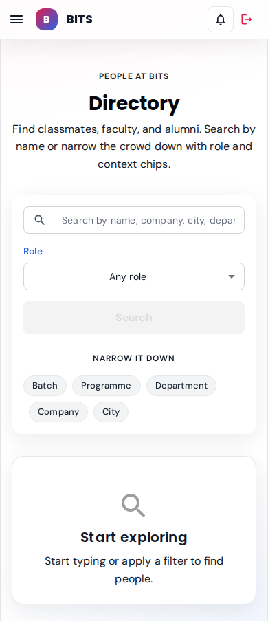 Search-first UX — users type a query or apply a filter to reveal results. "Start exploring" CTA is the default state.