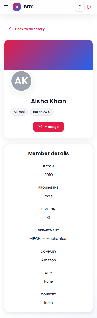 Public profile card: role chips, batch, programme, department, company, city. Message CTA starts a 1:1 thread.