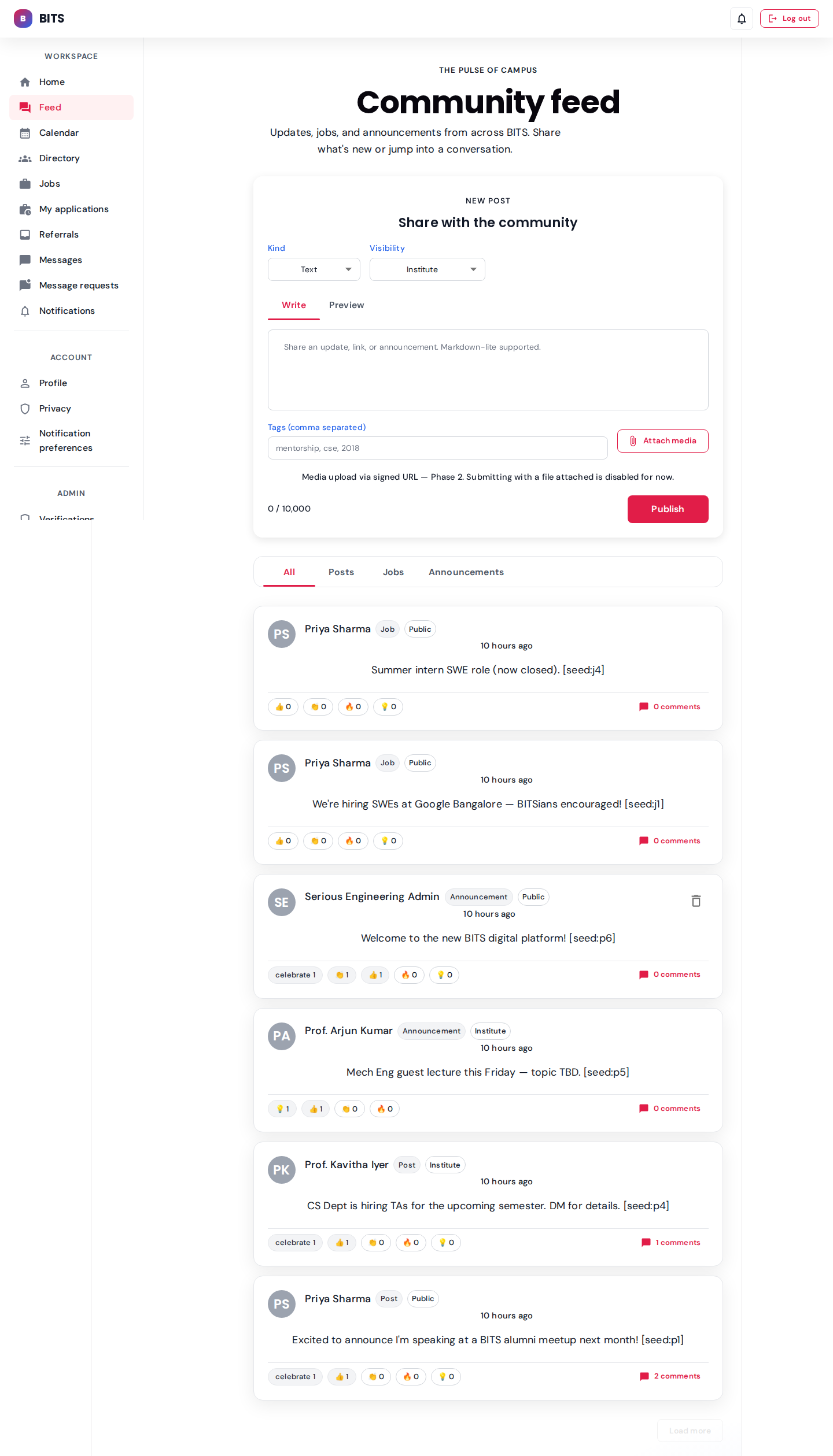 Admin sees posts across every scope: public + institute + own. Reaction counts reflect the 14 seeded reactions.