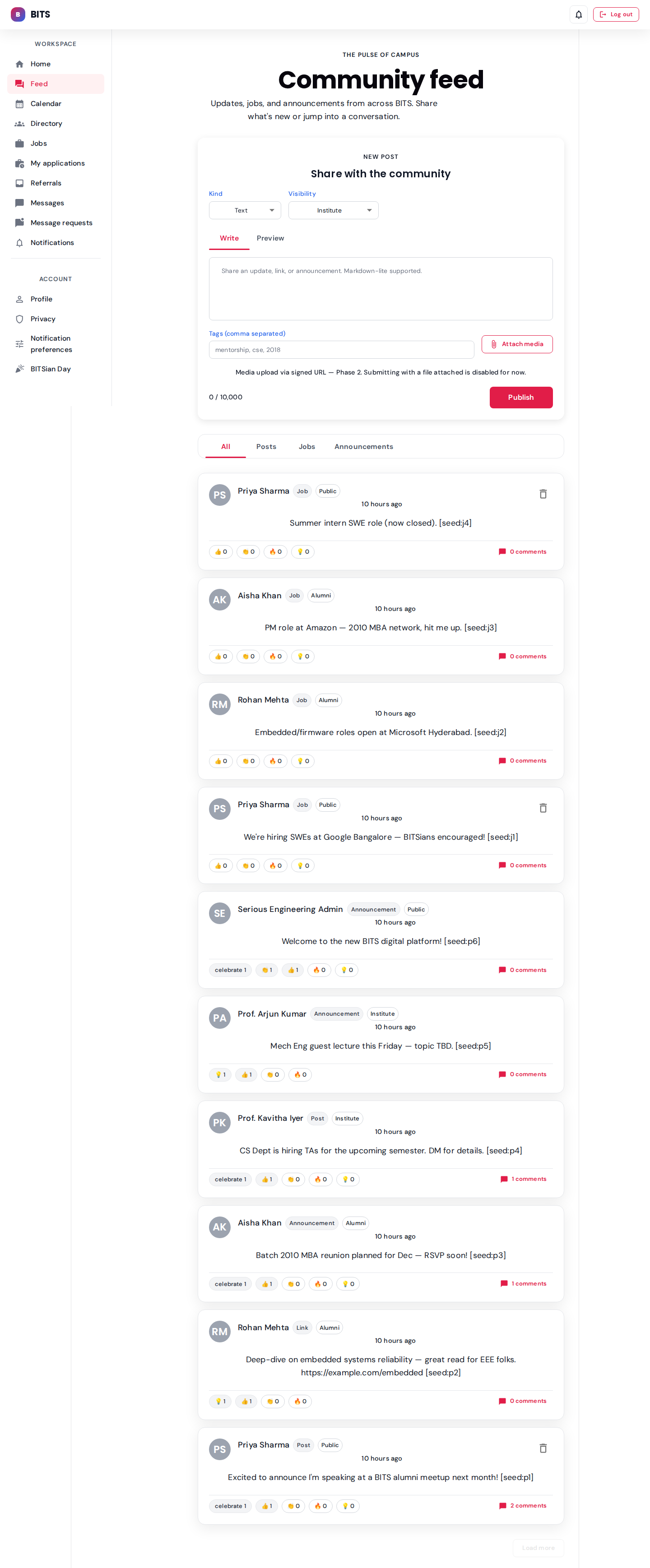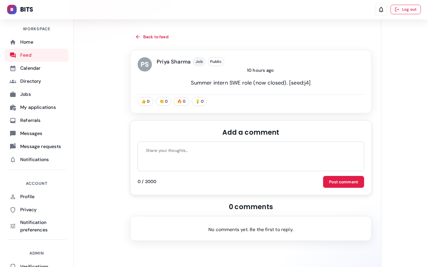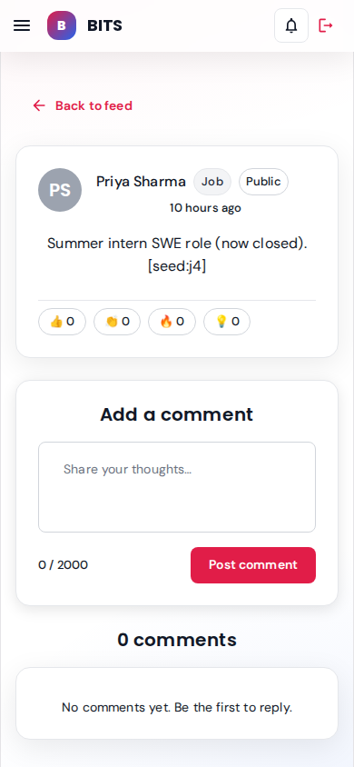 seeded: 7 posts, 4 comments, 14 reactionsPriya Sharma's "Summer intern SWE role" post with reaction tray and comment composer.