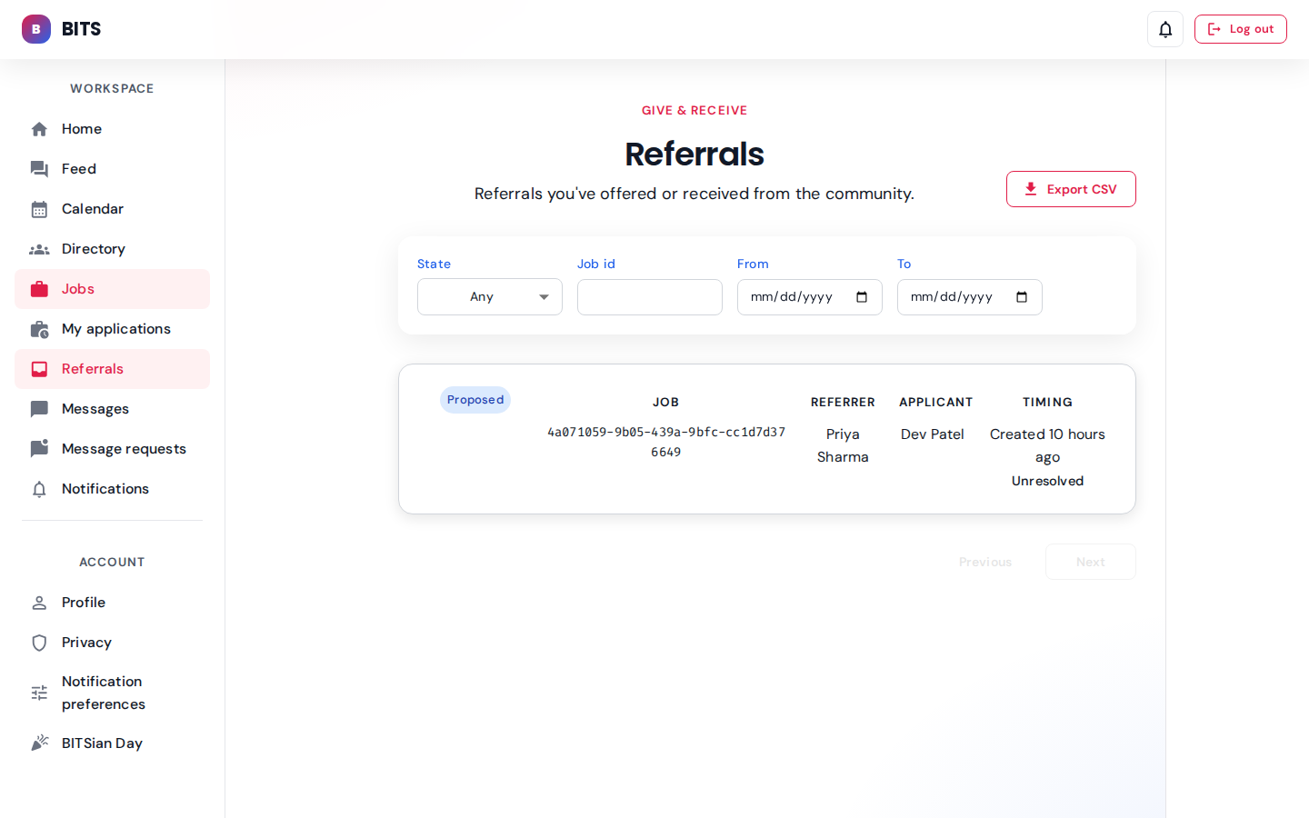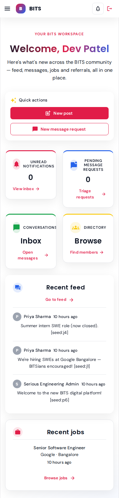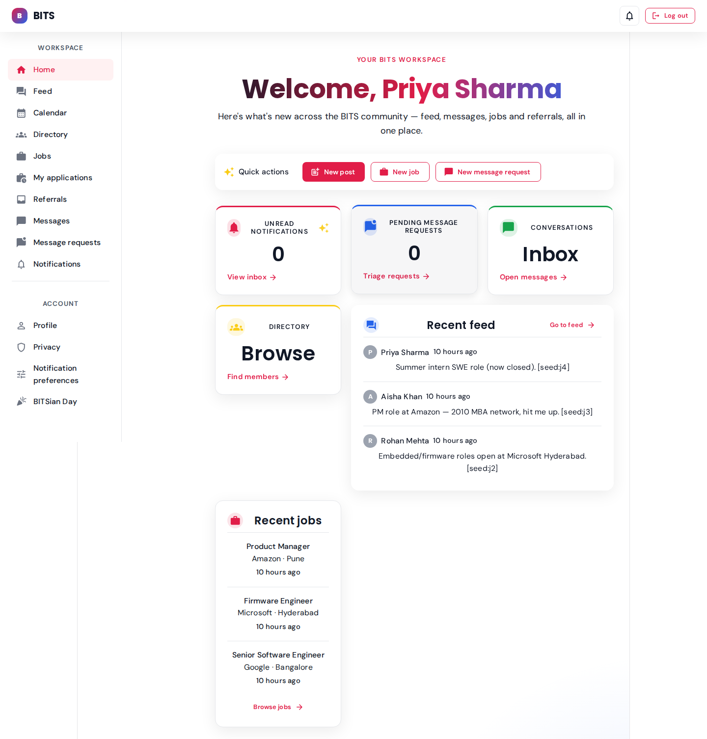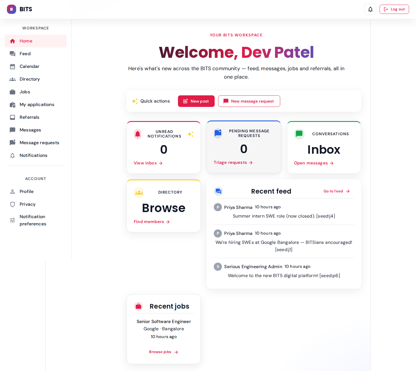 Priya's dashboard — quick links to jobs, referrals, messages with dev.student.