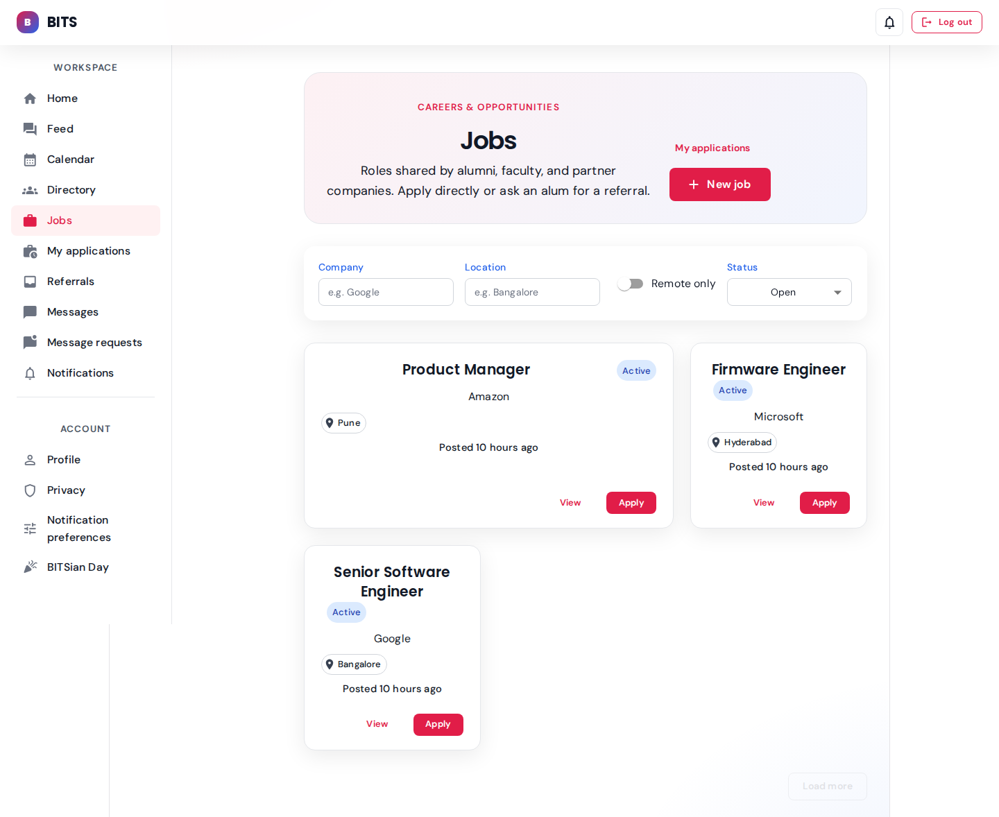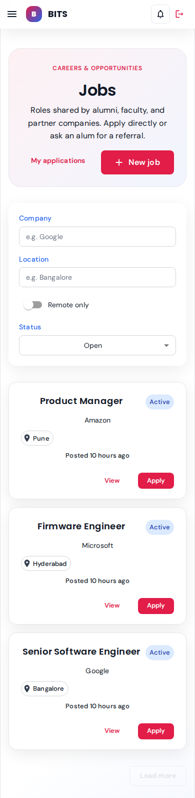 Three open roles seeded: Product Manager @ Amazon (Pune), Firmware Engineer @ Microsoft (Hyderabad), Senior SWE @ Google (Bangalore).