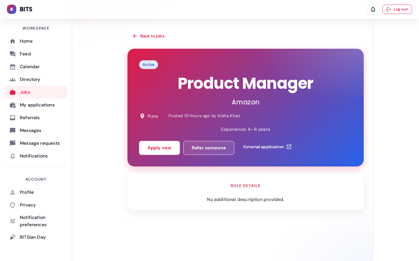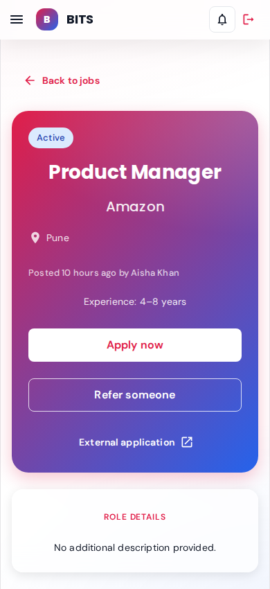 seeded: 3 open + 1 closedPosted by Aisha Khan. Apply-now + Refer-someone actions with external application link.