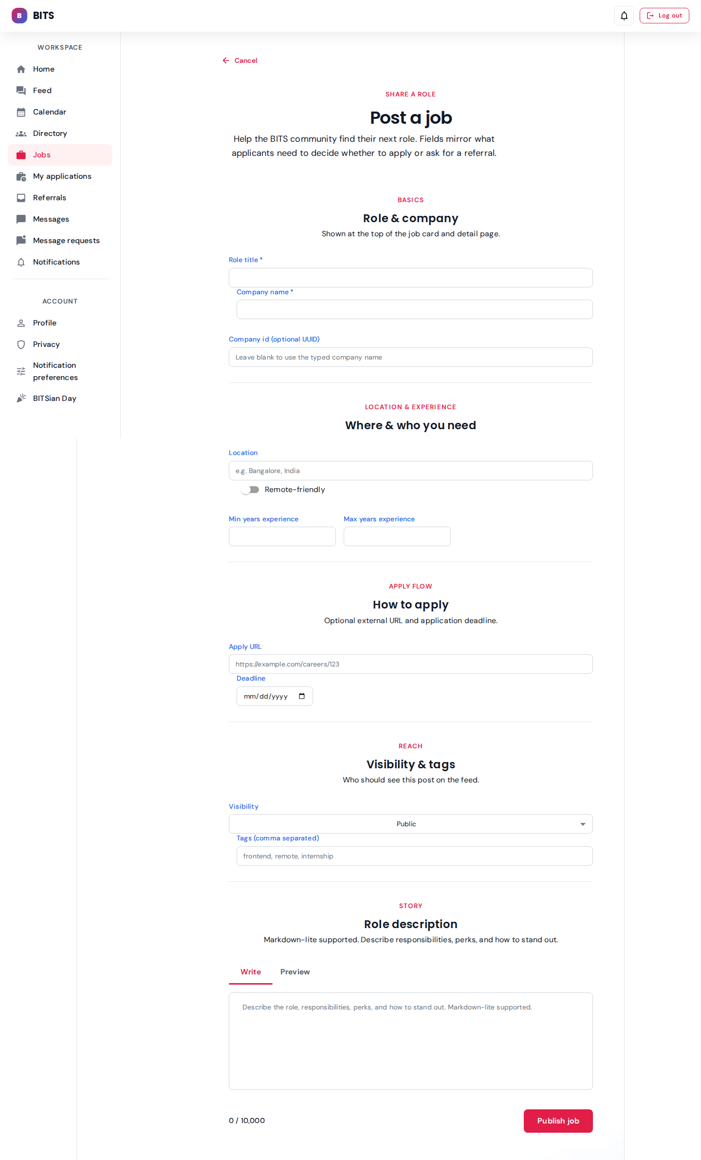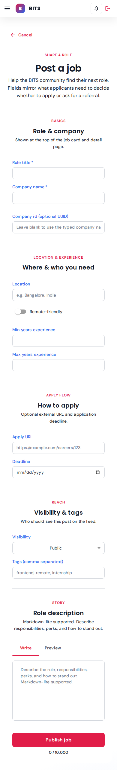 Alumni role lets Priya submit a new opening. Form covers title, company, location, experience, description.