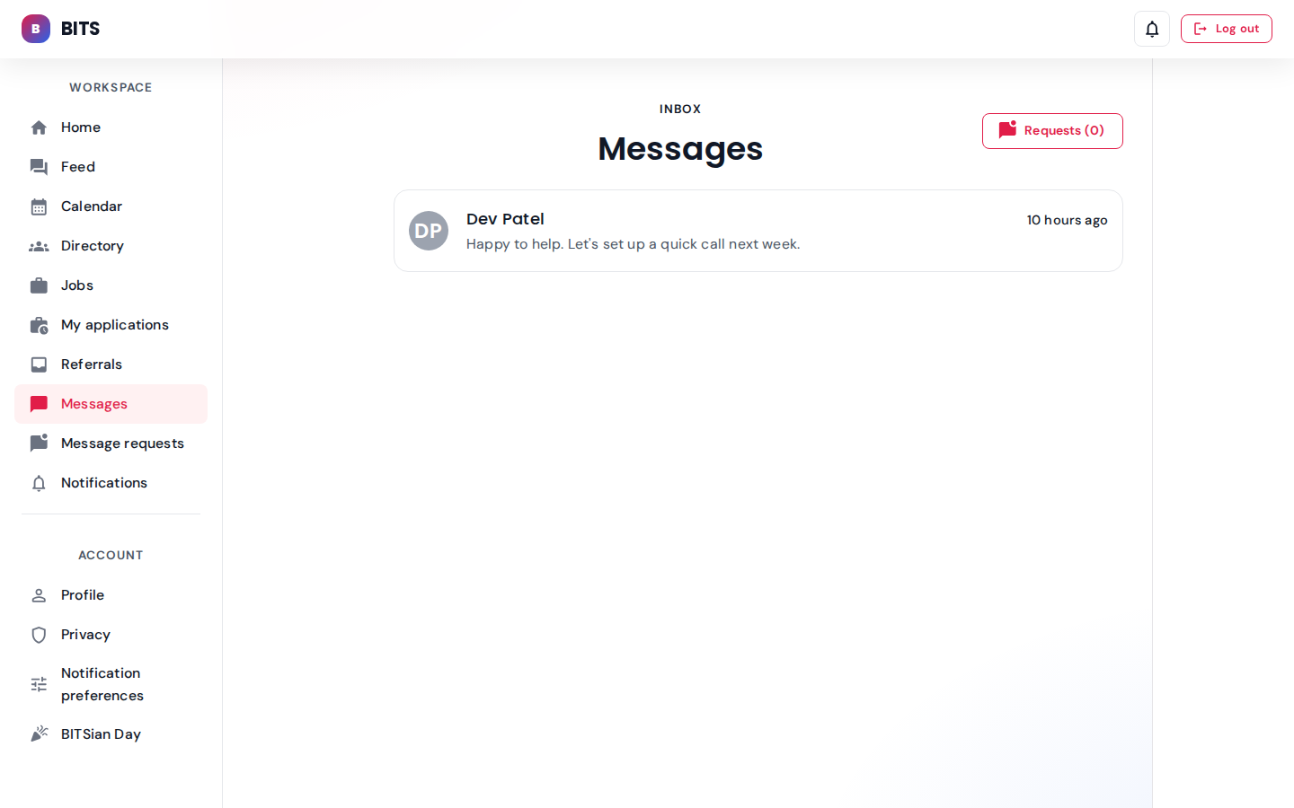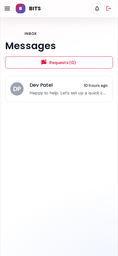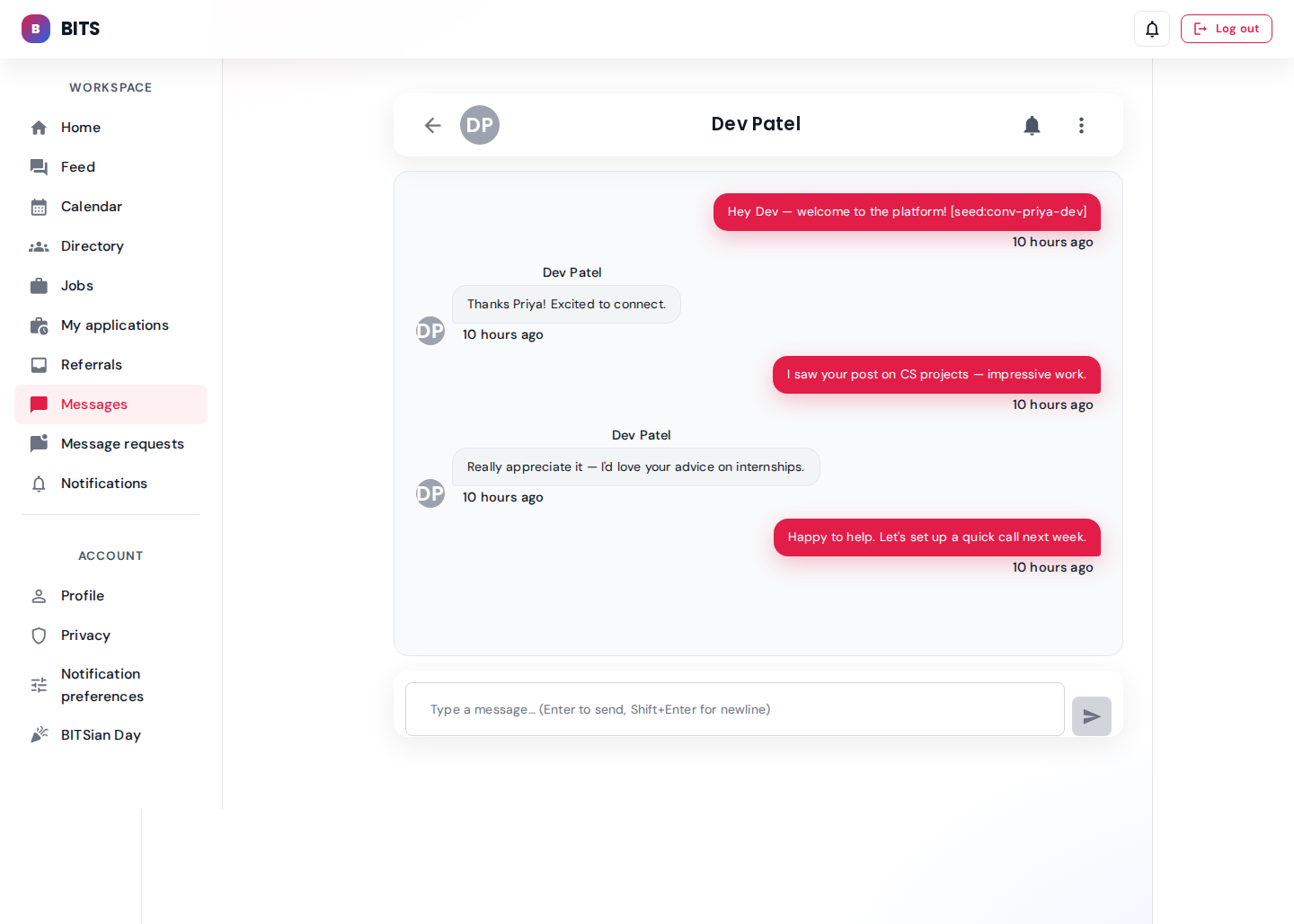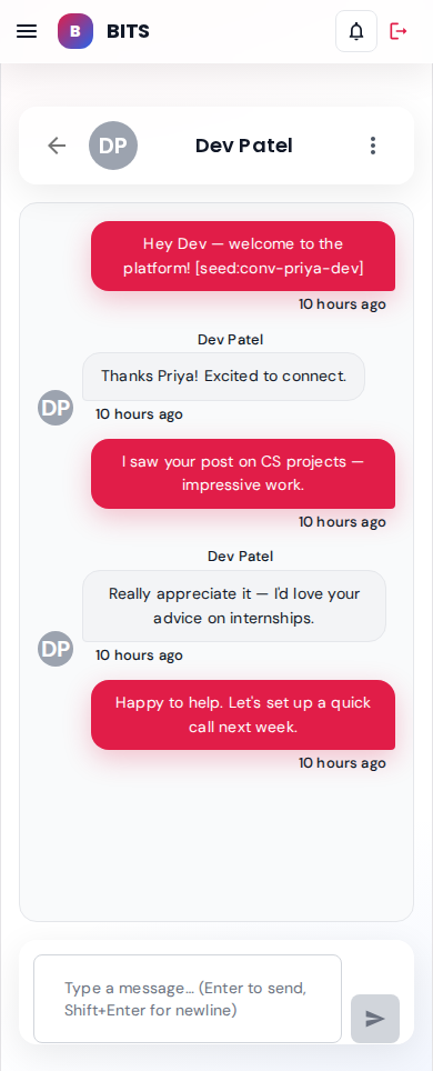 seeded: 1 accepted conv, 5 messagesFull 5-message thread: Priya's welcome, Dev's thanks, Priya's CS-project compliment, Dev's internship ask, Priya's "happy to help" reply.