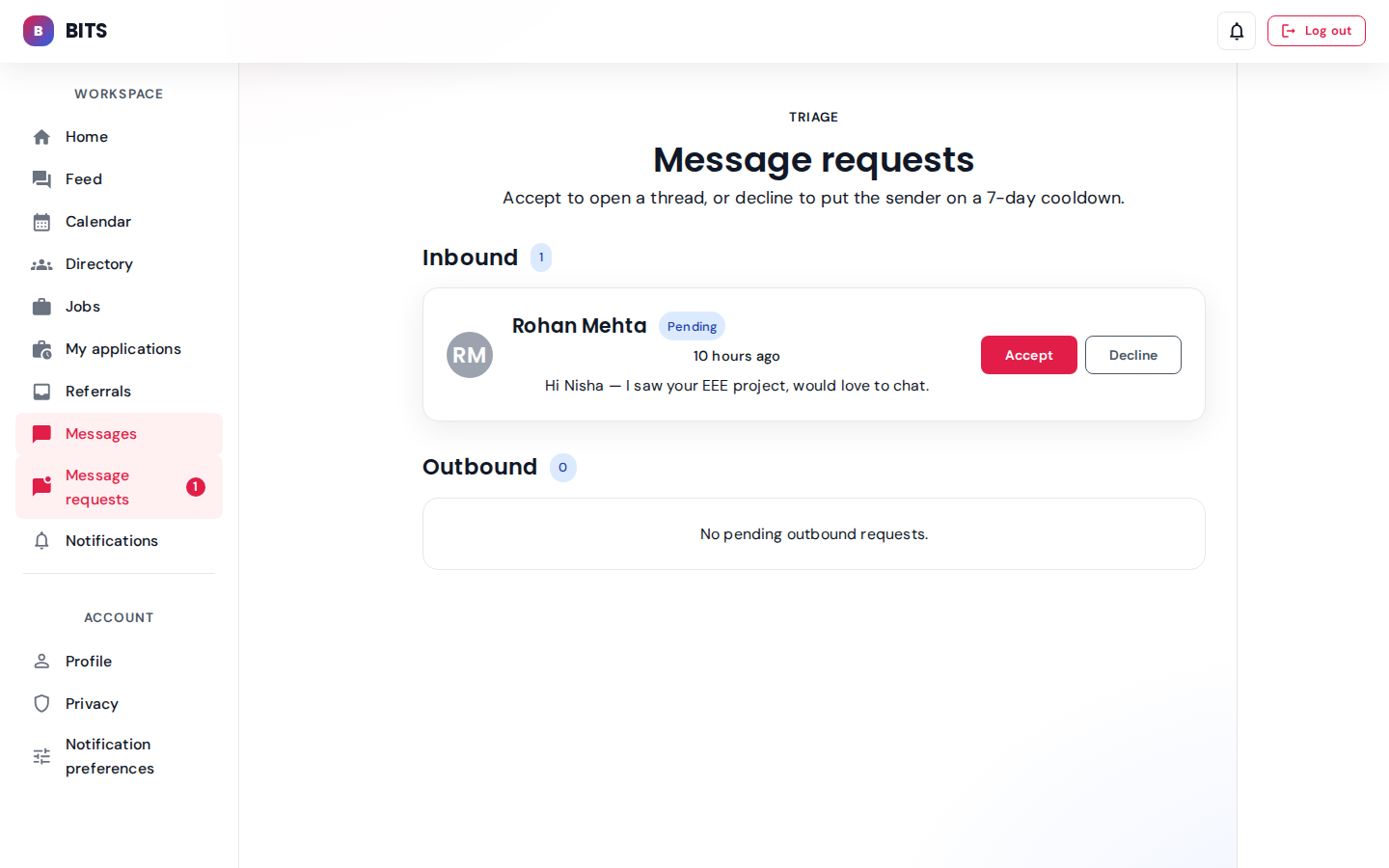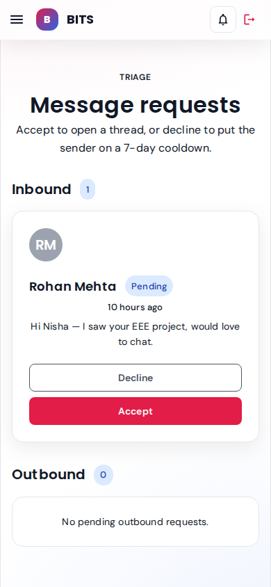 Two-sided approval-gated 1:1 DMs. Accepted threads go to Inbox; unsolicited ones sit in Requests.