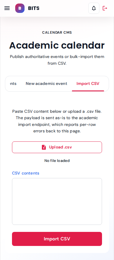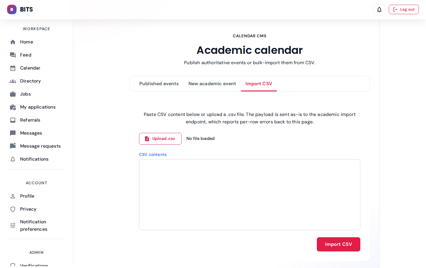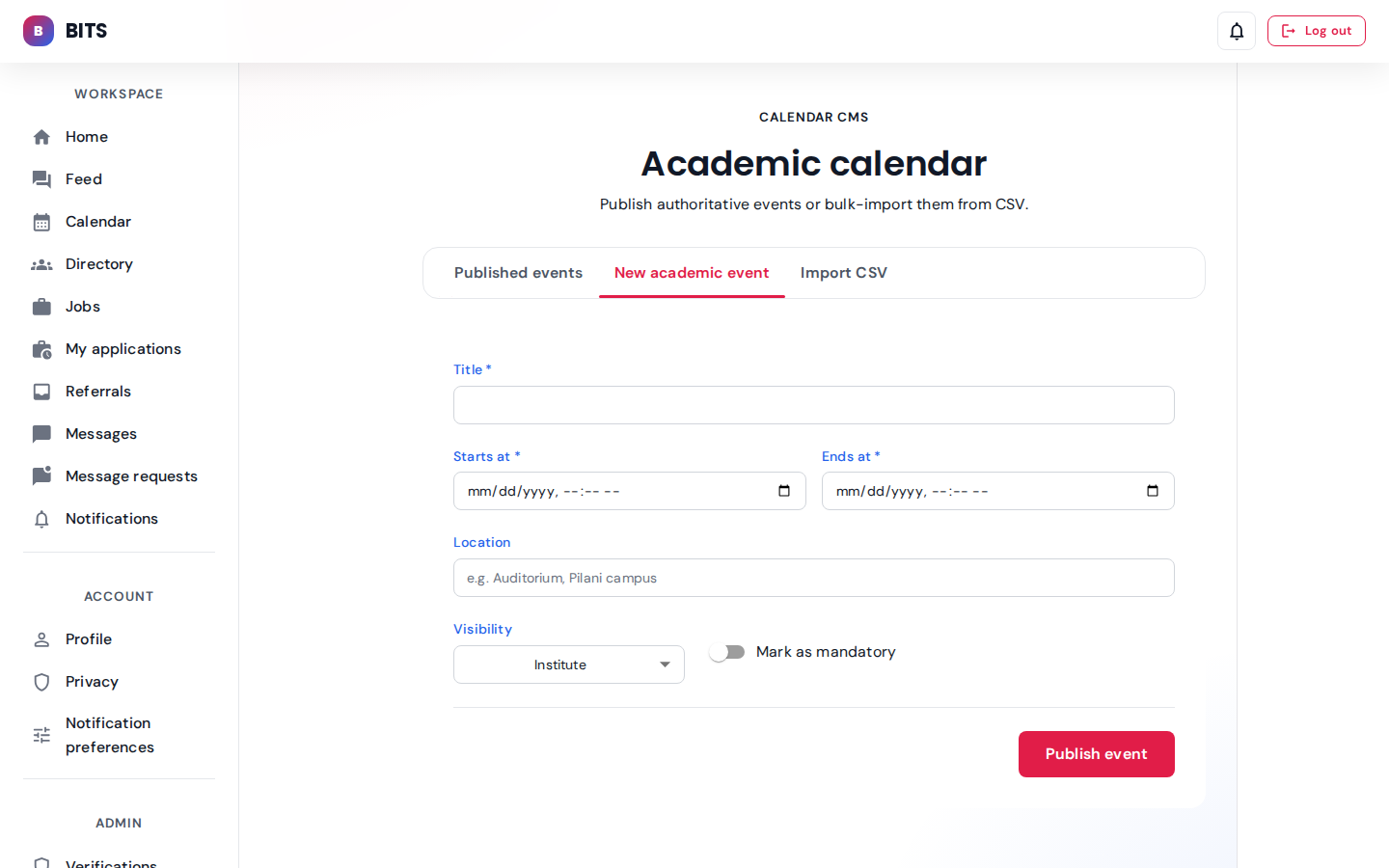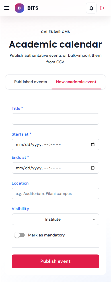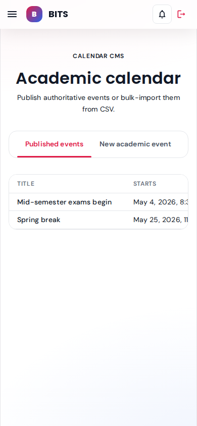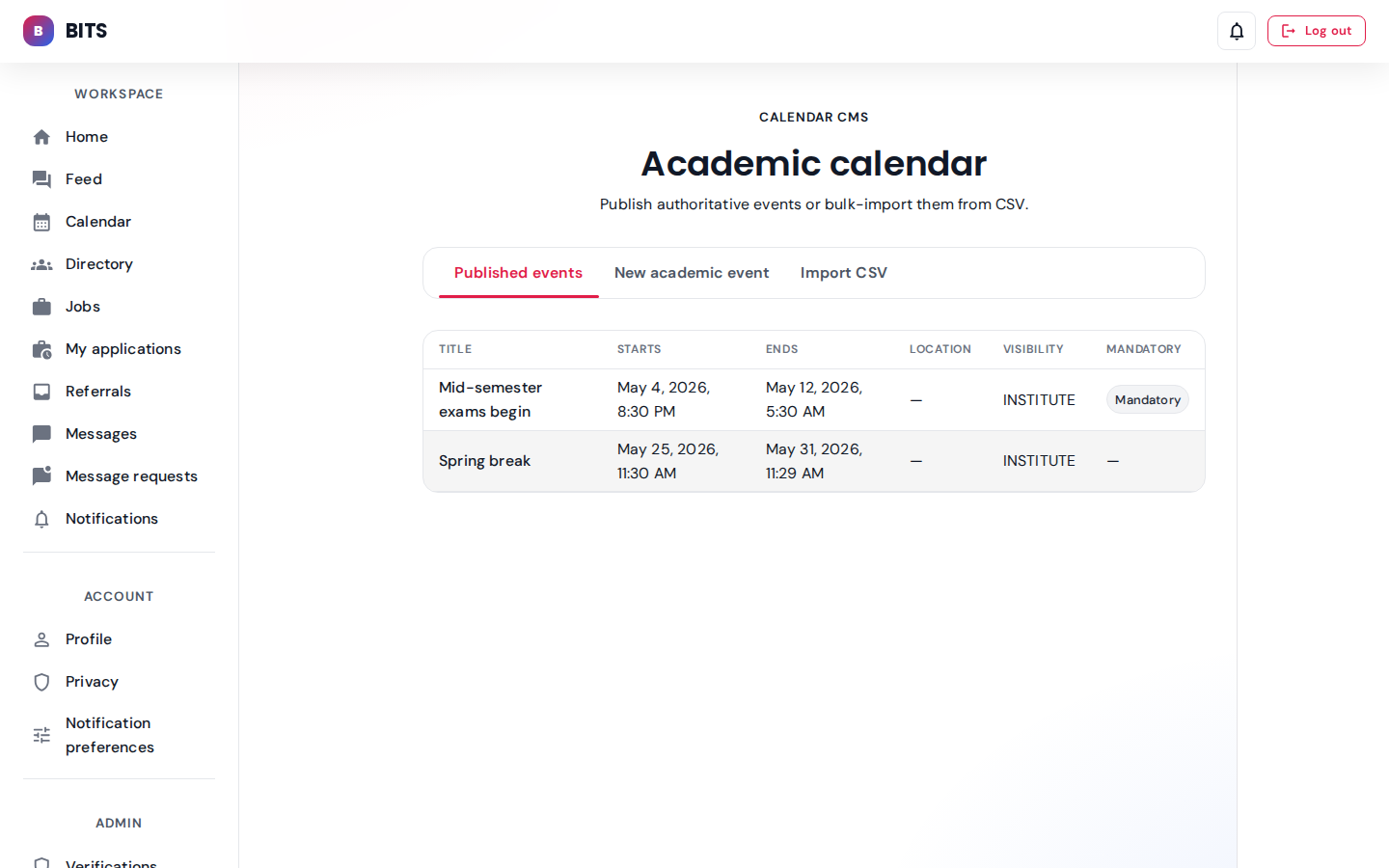 Admin — calendar CMS & BITSian Day dashboard role: admin