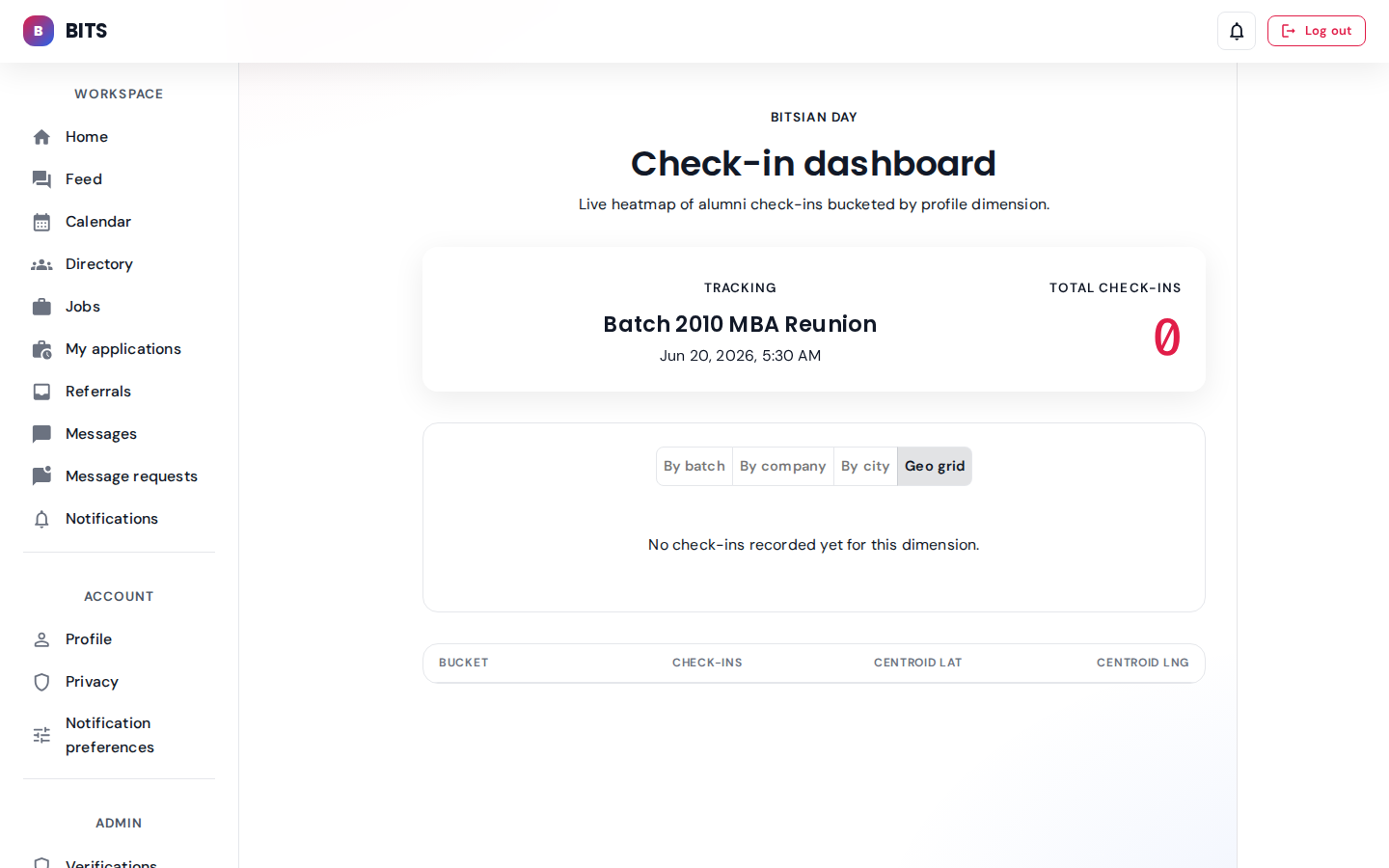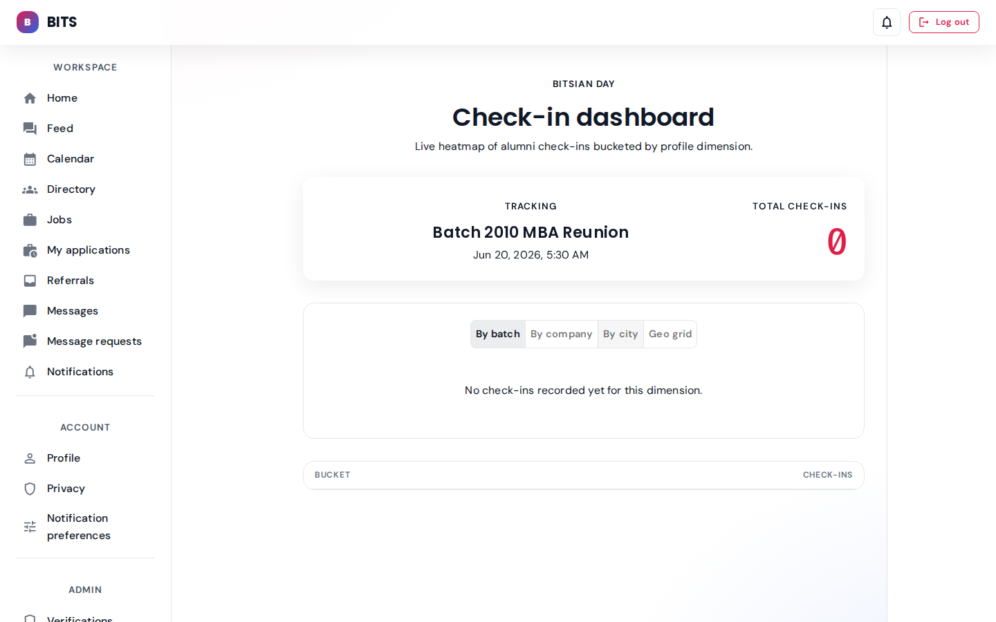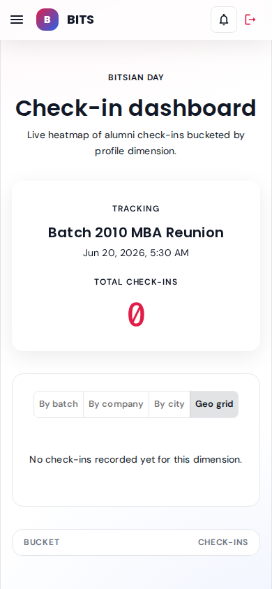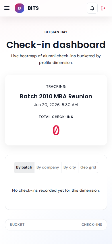 Live count of alumni check-ins bucketed by batch year. Default dimension.