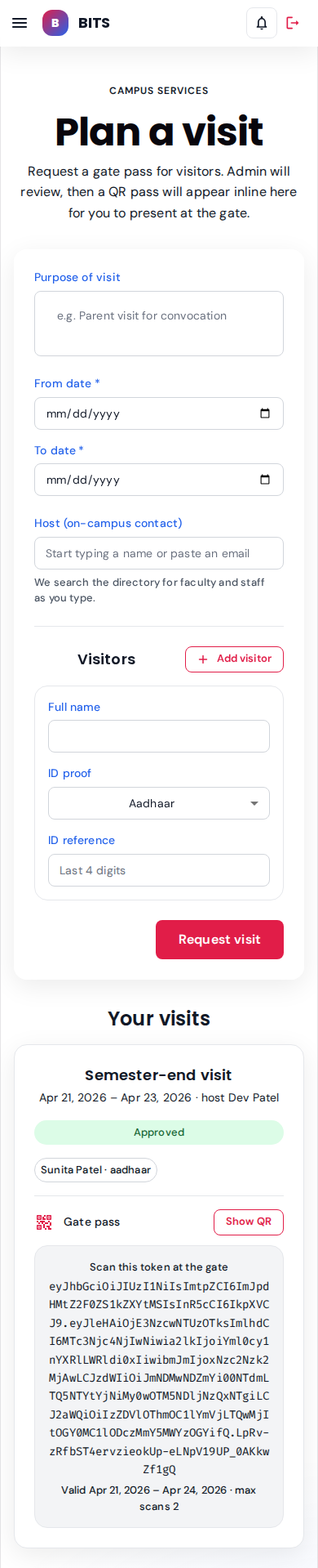 Visits with digital gate passes, guest-house bookings, faculty appointments, late-entry log, and the security scan console.
