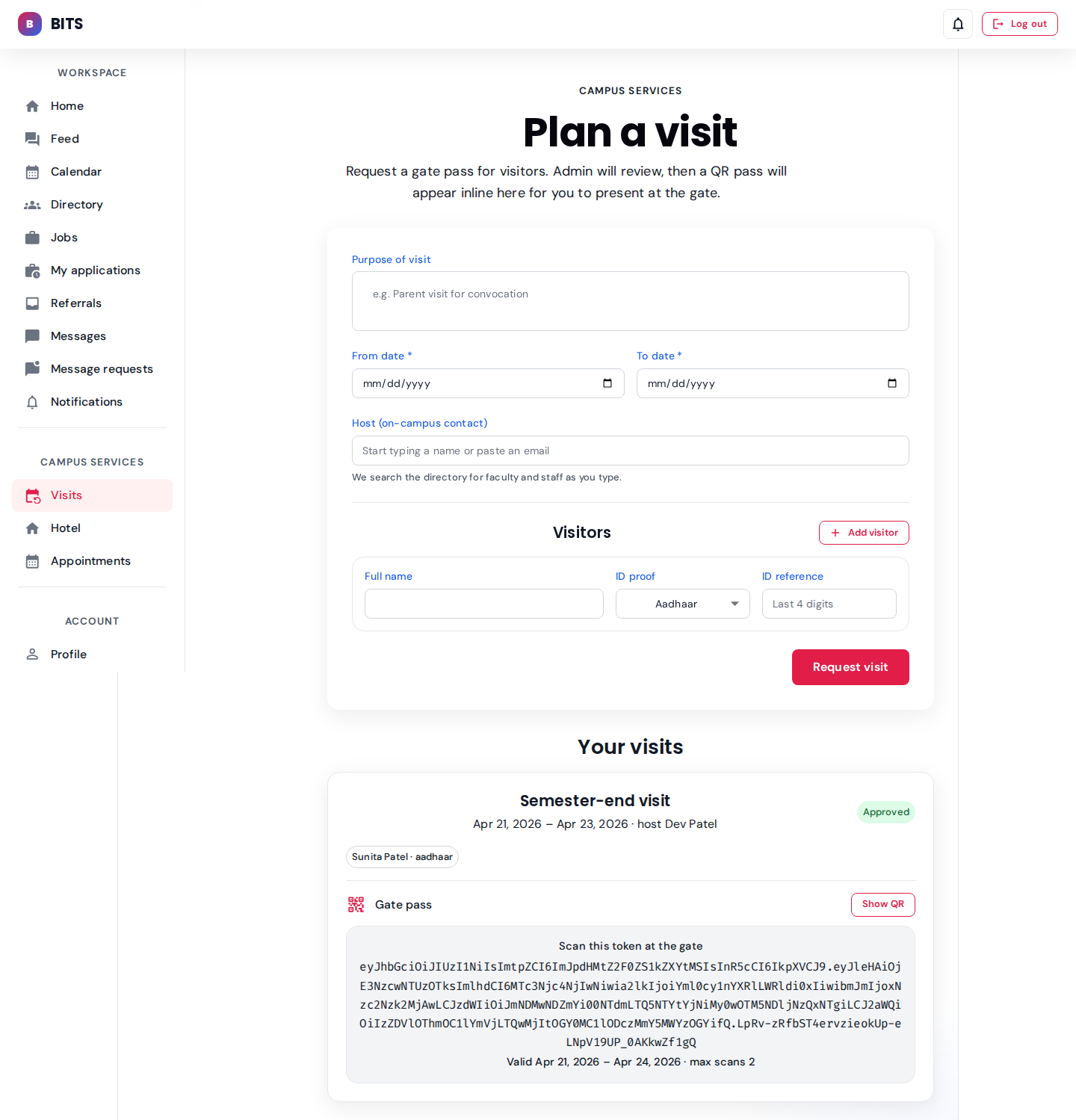 seeded: 1 approved visit, valid 2 daysDate window, host lookup, and visitors table (name + ID proof). Submitting queues the request for admin review.