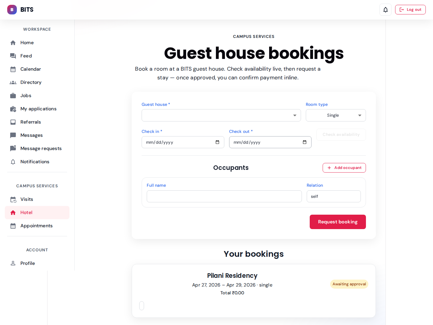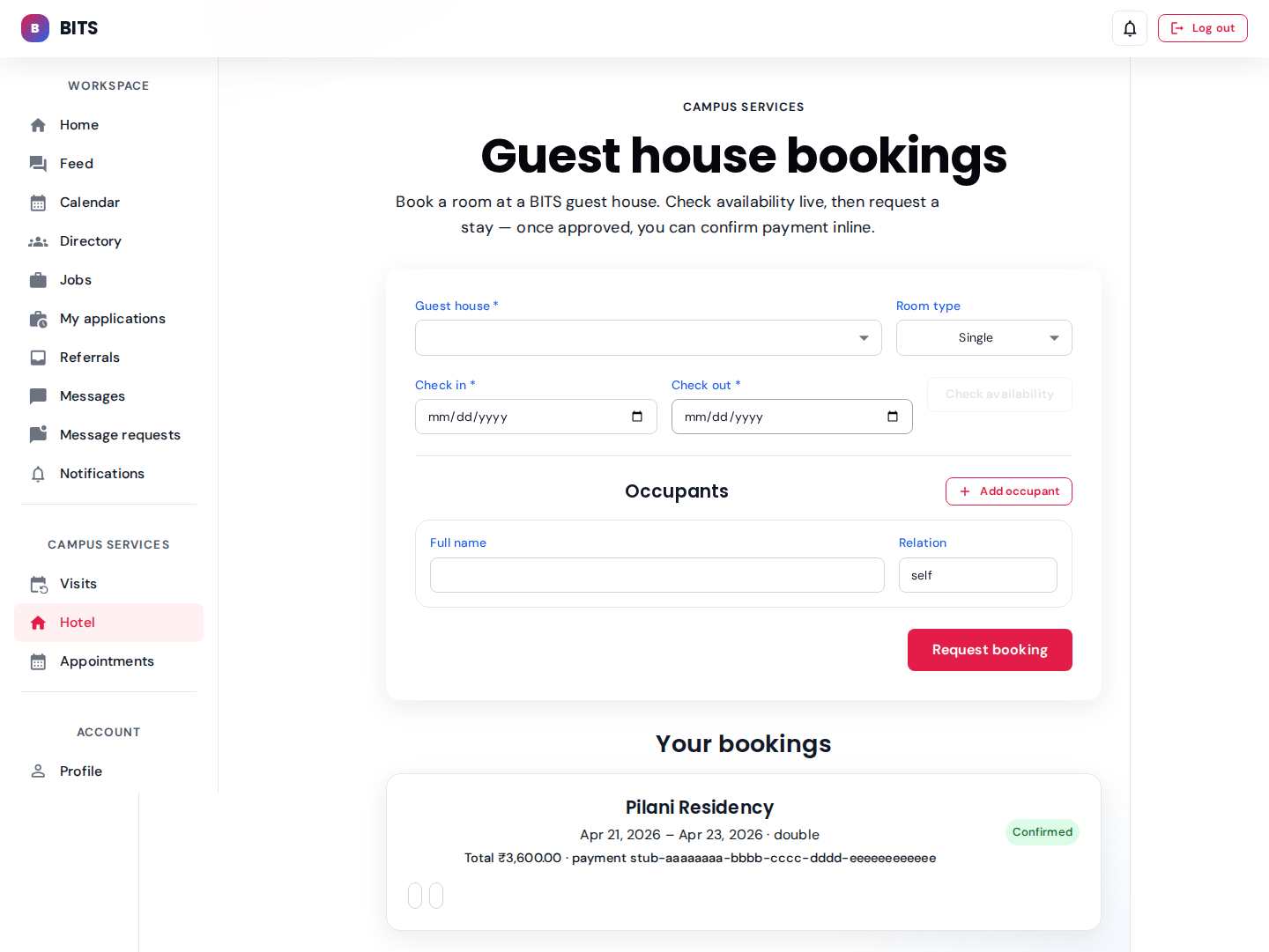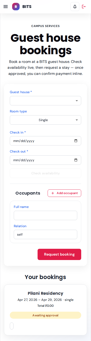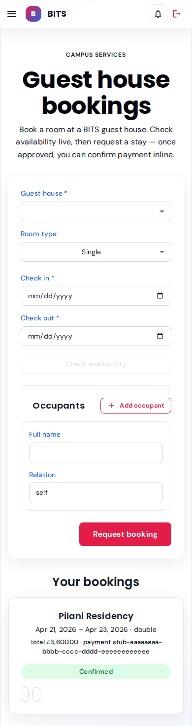 Availability widget plus "Your bookings" rail. Sunita's Pilani Residency stay (Room 201, Apr 21–23) shows a Confirmed chip.