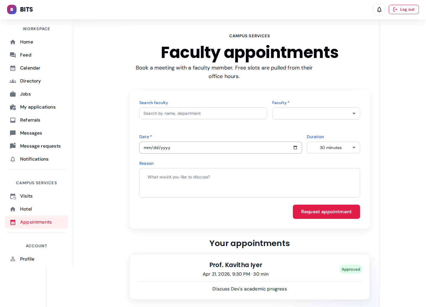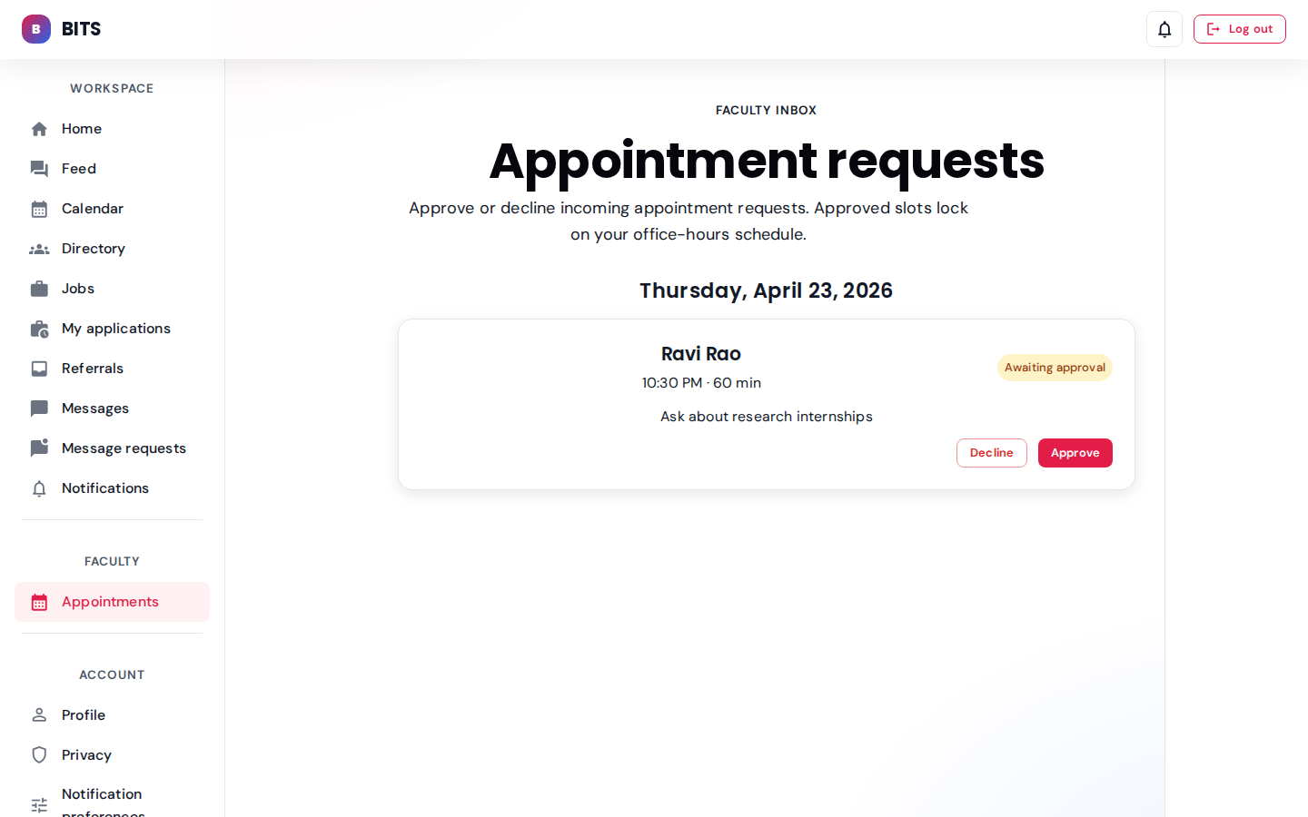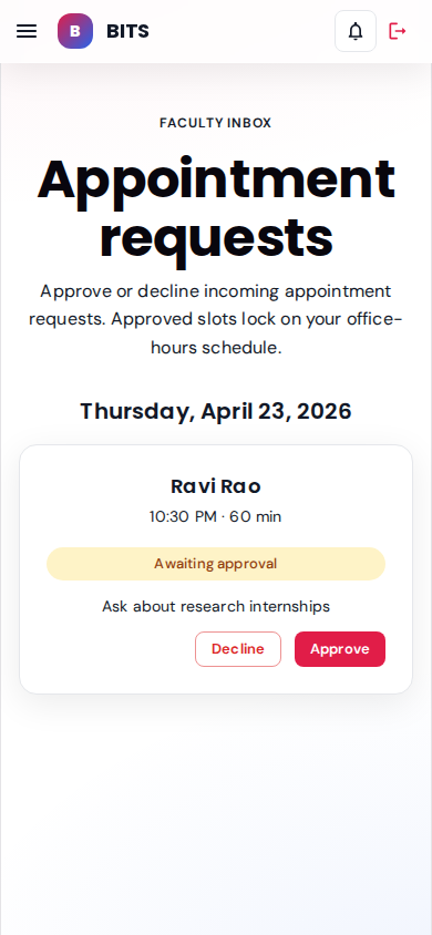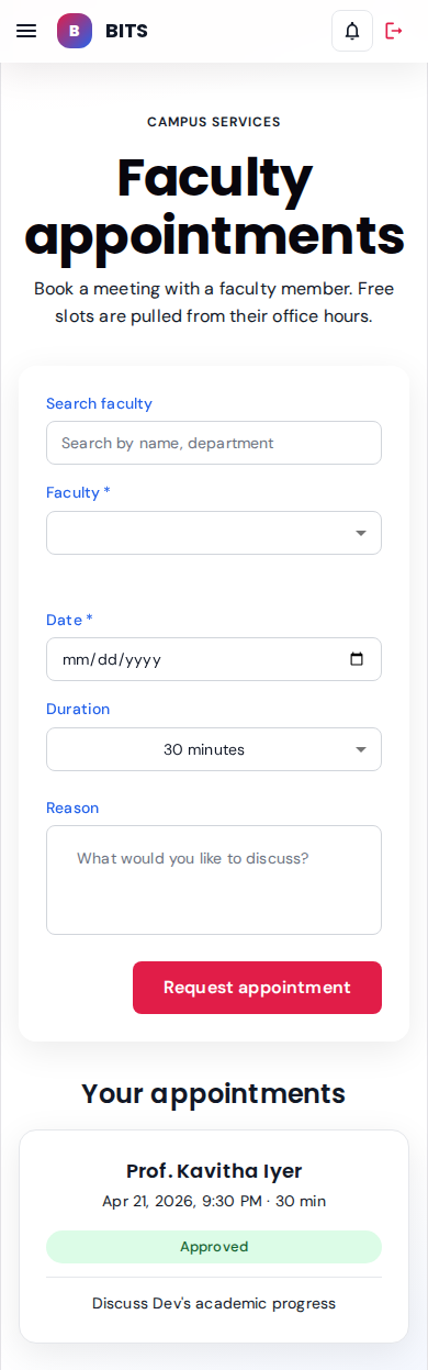 seeded: 1 confirmed booking, ₹3,600 totalApproved slot with Prof. Iyer. Parent can cancel before the faculty member locks the slot.