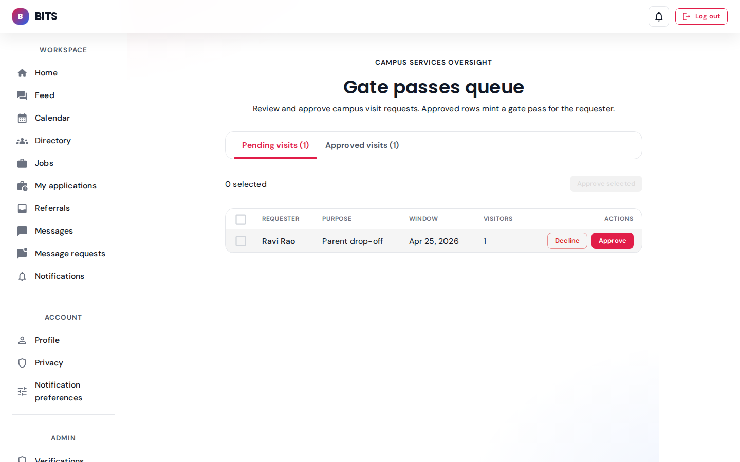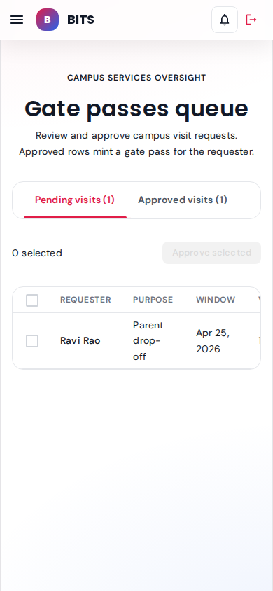 Pending tab surfaces Ravi's visit request; Approve mints a signed QR pass, Decline records a reason. Bulk-approve handles roster-day spikes.