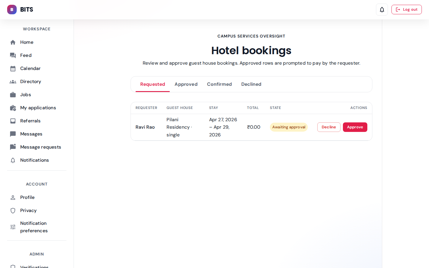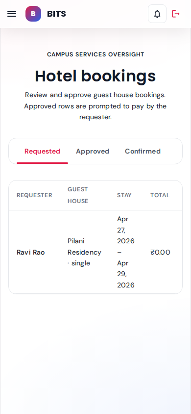 Admin-only view across every guest house — approve / decline / cancel, with a running ledger of payment stubs.