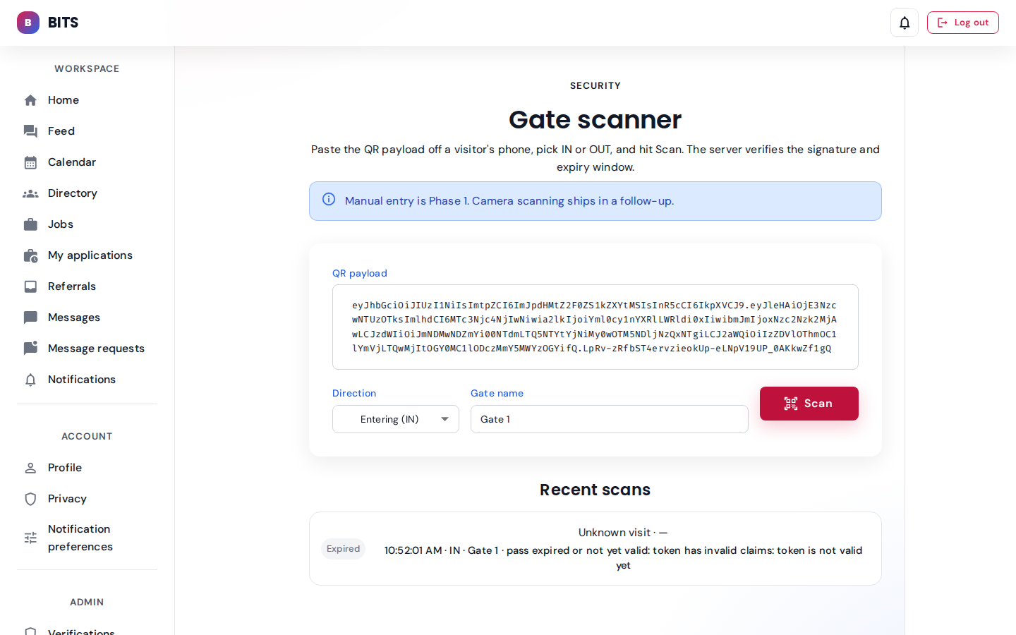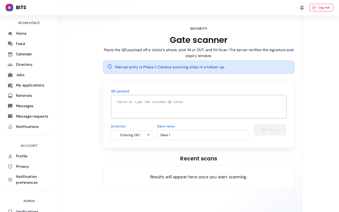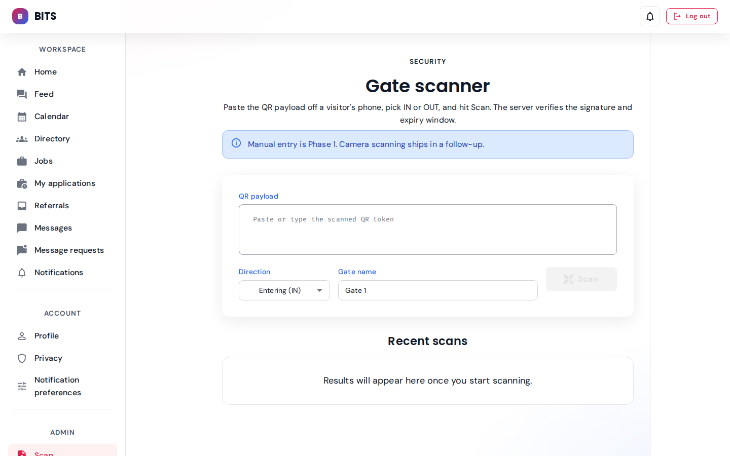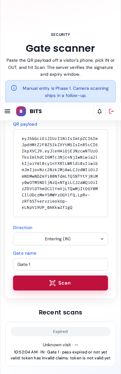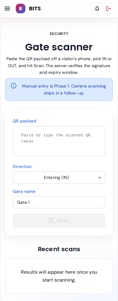 Manual QR-entry console for security. Paste the scanned payload, pick IN / OUT + gate, hit Scan. Camera mode ships in Phase 2.