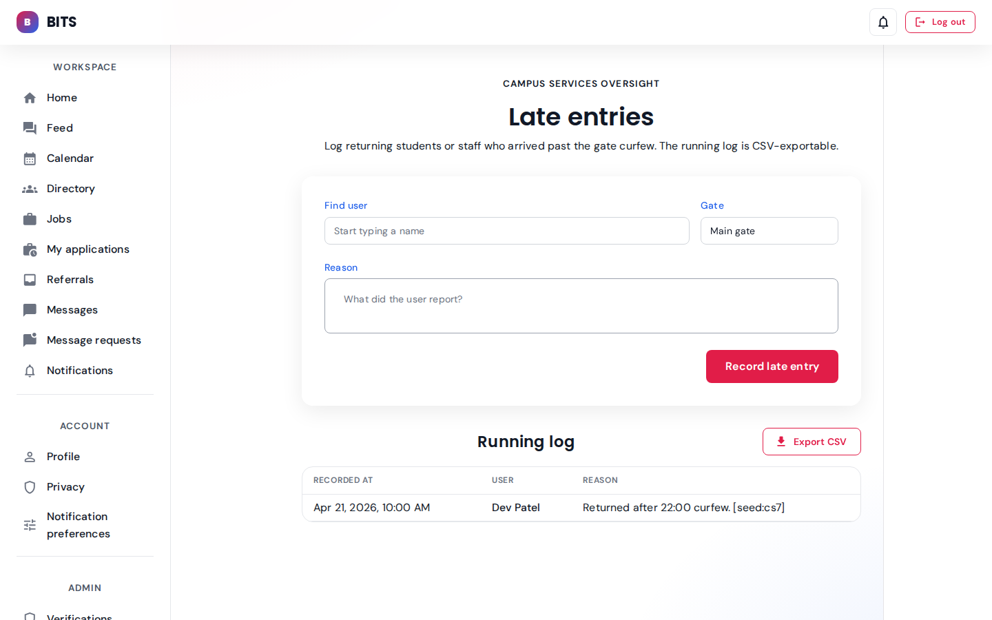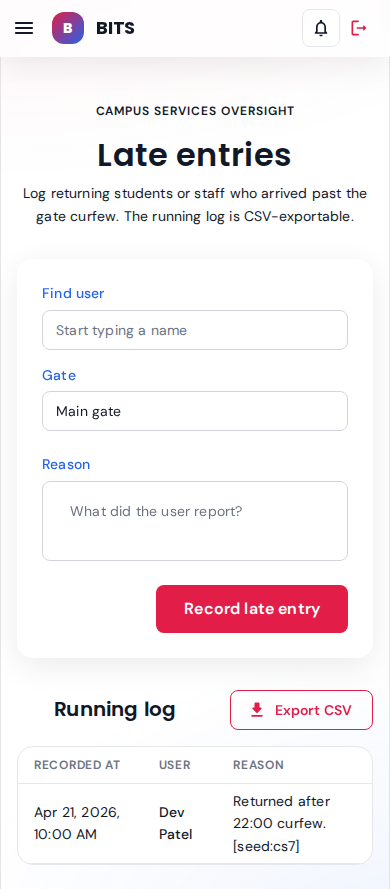 Post-curfew returns recorded by security for audit; one seeded row for dev.student.